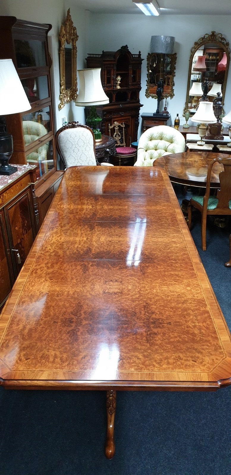 Outstanding two leaf pedestal burr walnut dining table, walnut base, herringbone walnut inlay, walnut cross banding, can be used one, two or no leaves, excellent colour and condition, sorry about the light reflection.