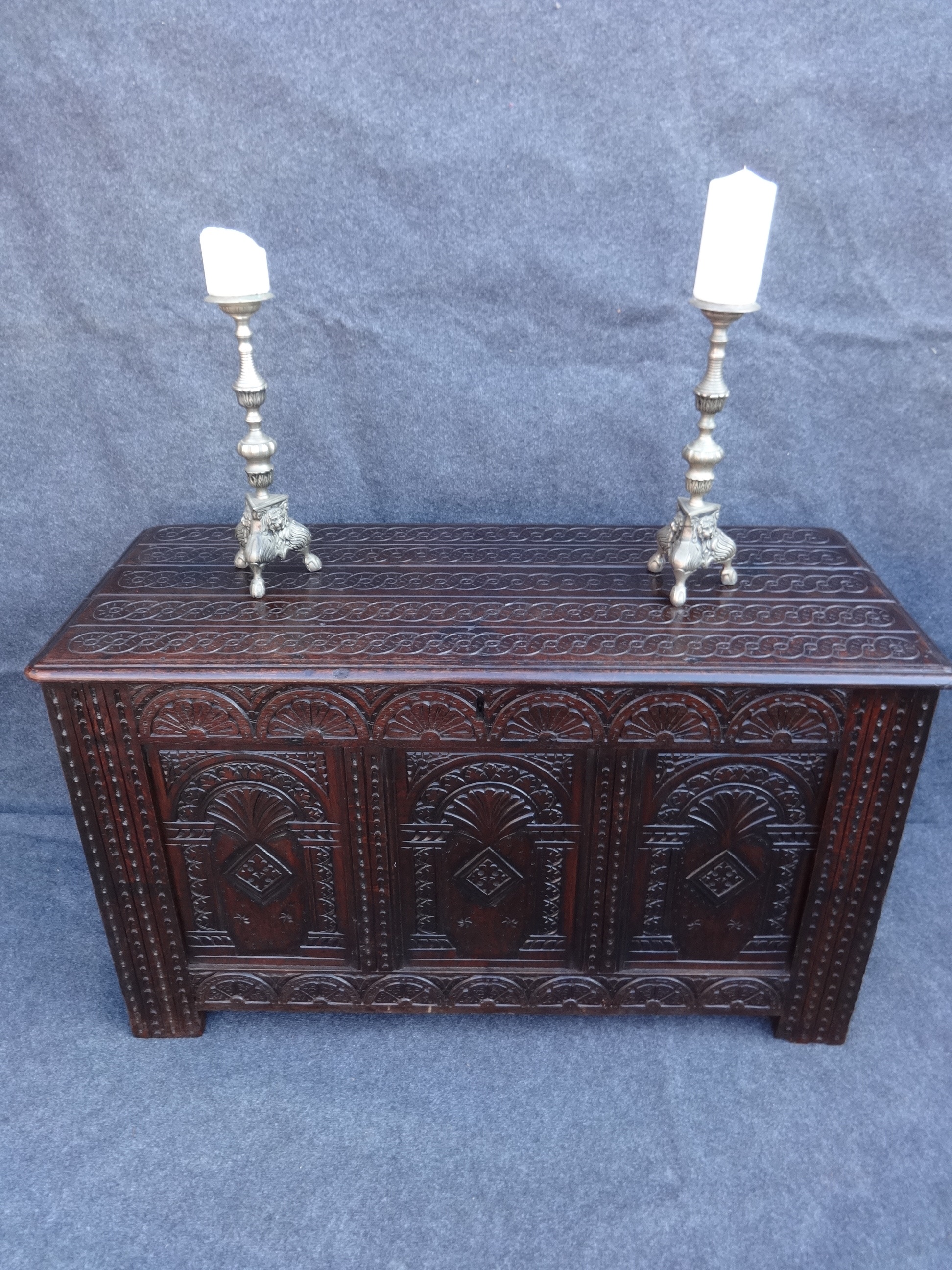 17th Century antique oak coffer with very good crisp carving and excellent colour.
