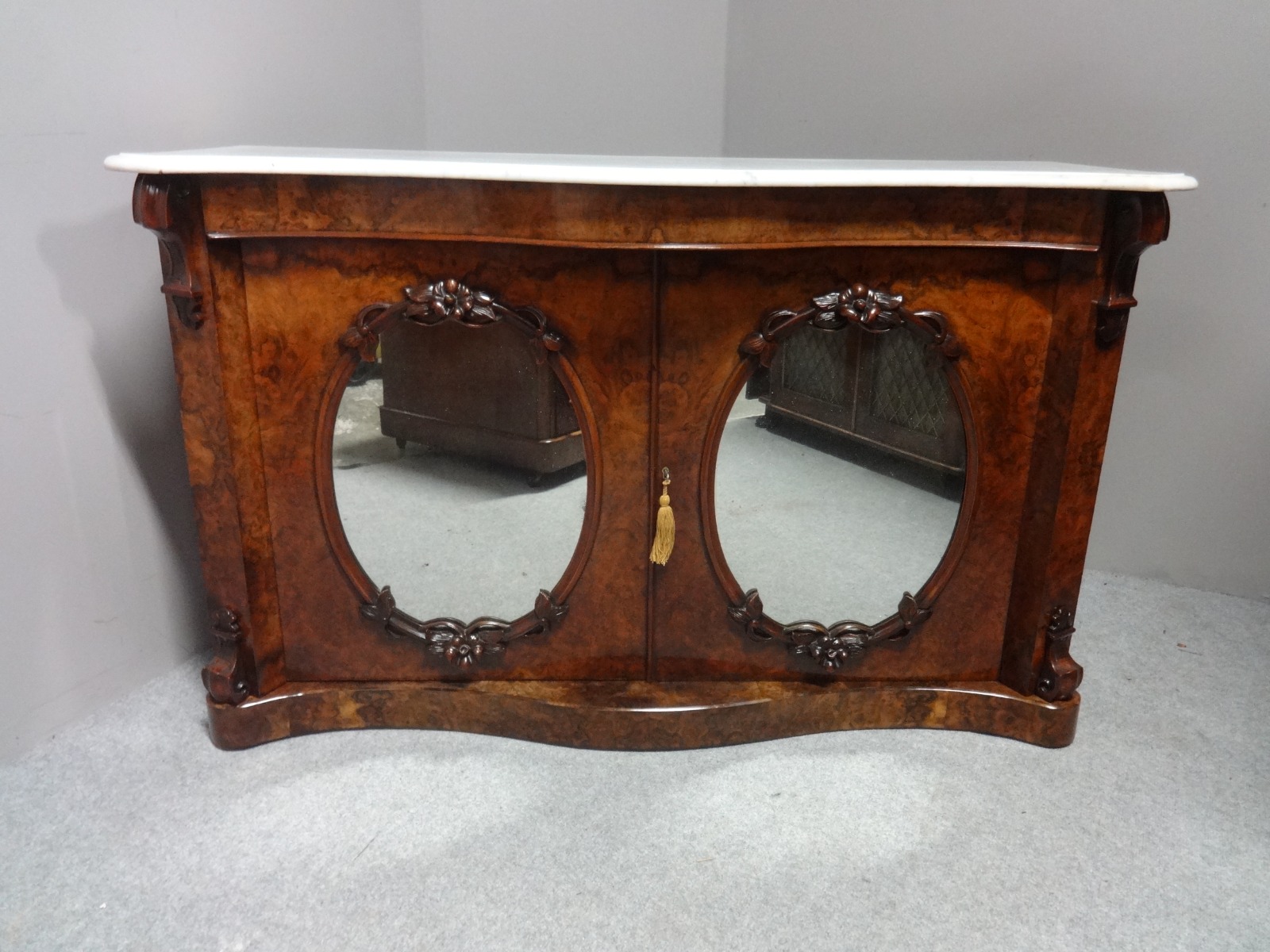 A very good quality serpentine Victorian burr walnut sideboard/credenza, with oval glass doors, white marble top, opens to reveal single shelf, in very good condition.