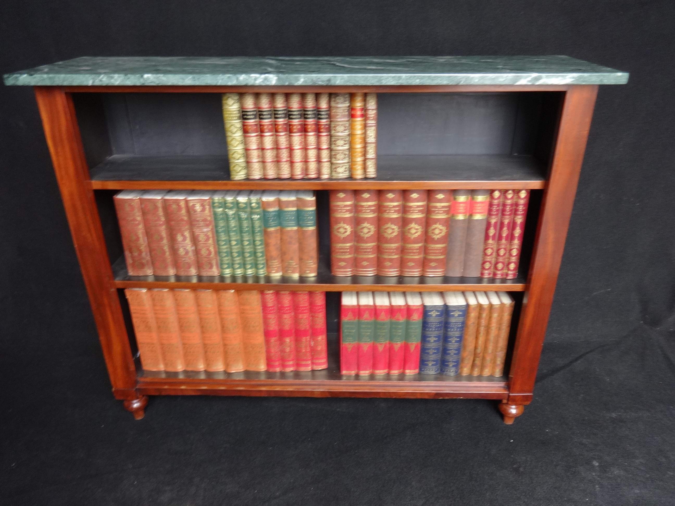This is an wonderful antique mahogany bookcase that has a green marble top and fixed shelves inside. It is in excellent condition.