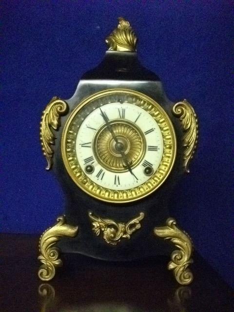 A distinctive American cast steel/metal clock from 1880. This vintage piece has a pretty enamel face with ormalou detailing. It also keeps good time.