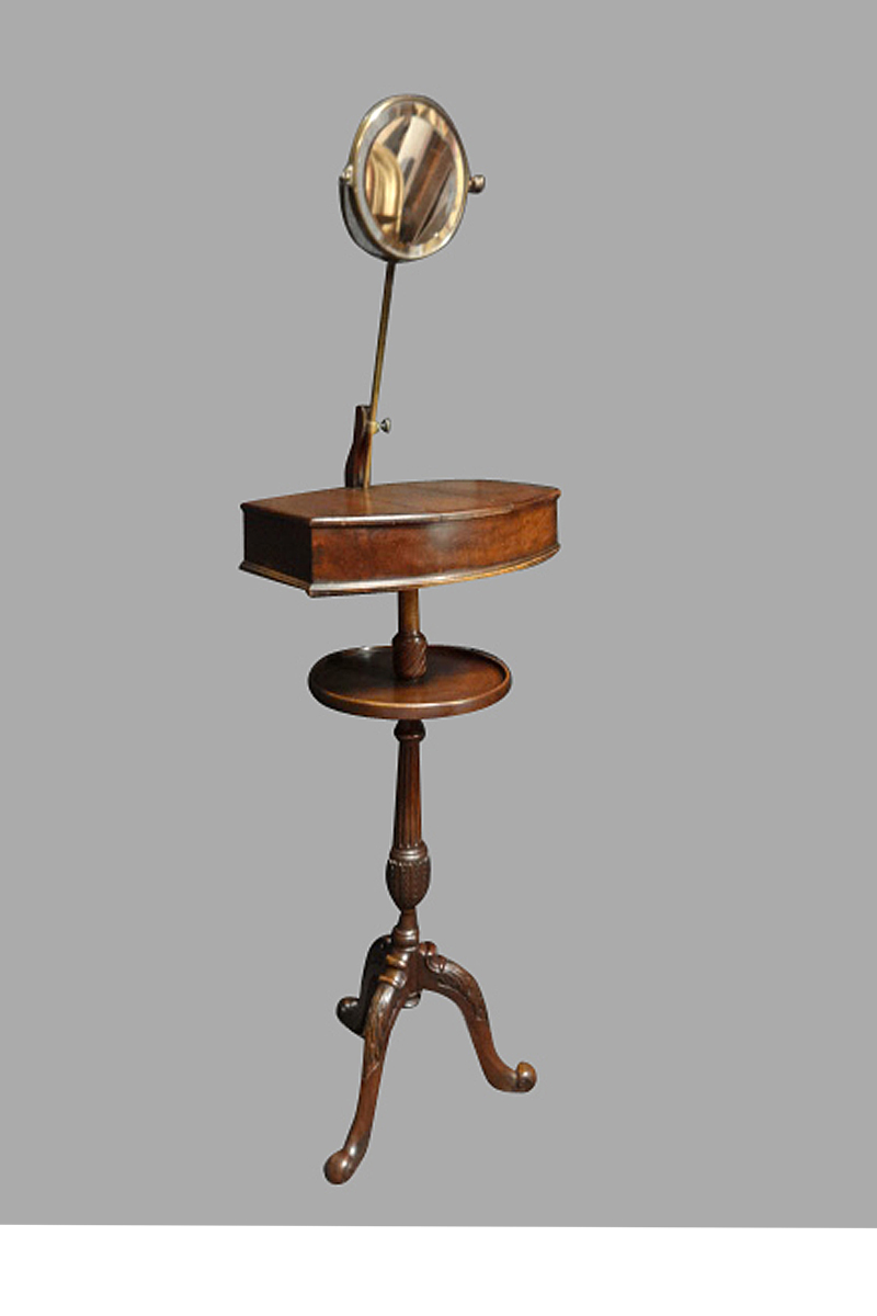 This is a good mahogany brass shaving mirror with brass extension pole, on a mahogany stand with lift up sides, in very good original condition.