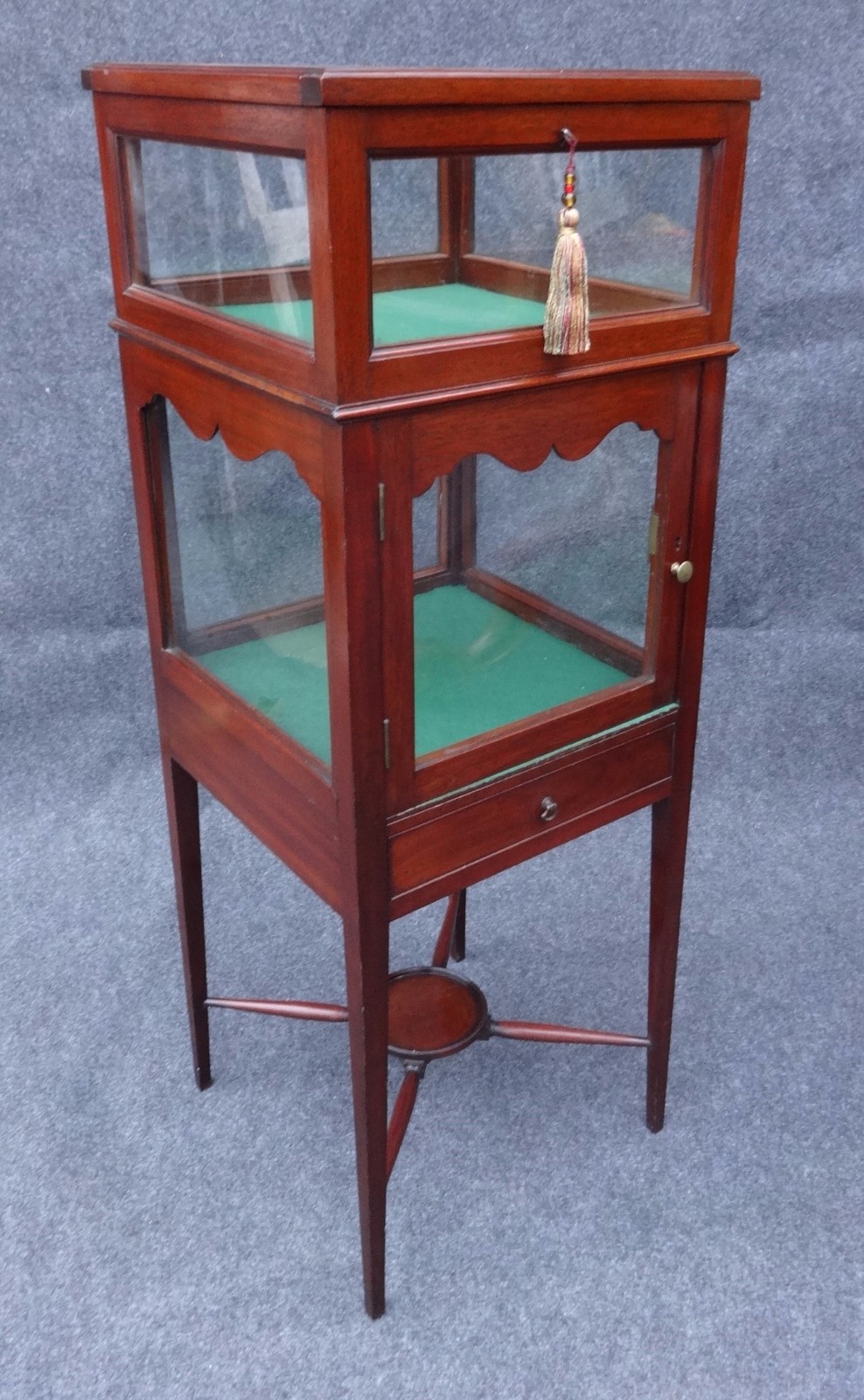 This is a pretty antique mahogany display cabinet with bijouterie top, drawer under, in very good original condition.