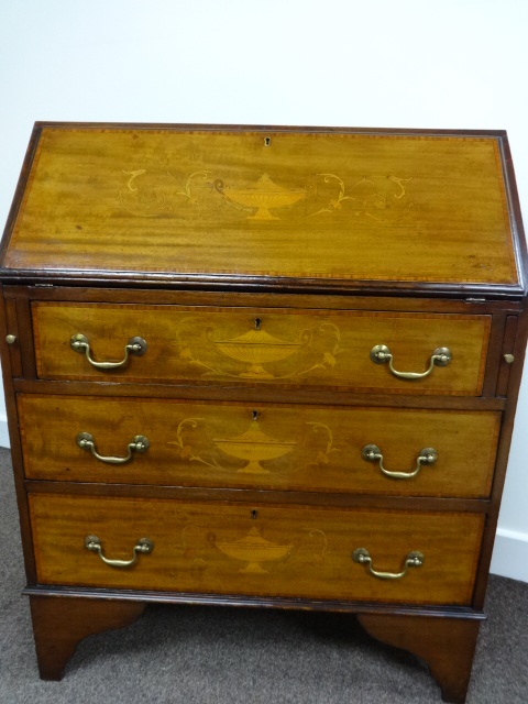 This is a very pretty antique mahogany bureau, inlaid with urns and swags to the fall-front and drawers, oak lined drawers, in very good original condition, with original key.