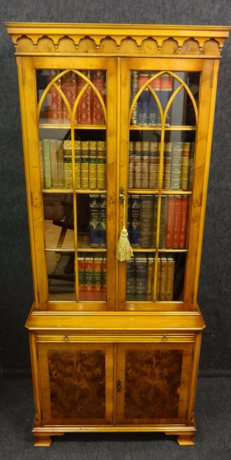 An excellent quality Bevan and Funnel yew wood bookcase with 3 adjustable shelves to the bookcase, single shelf and slide to the base, standing on ogee bracket feet and in excellent condition.