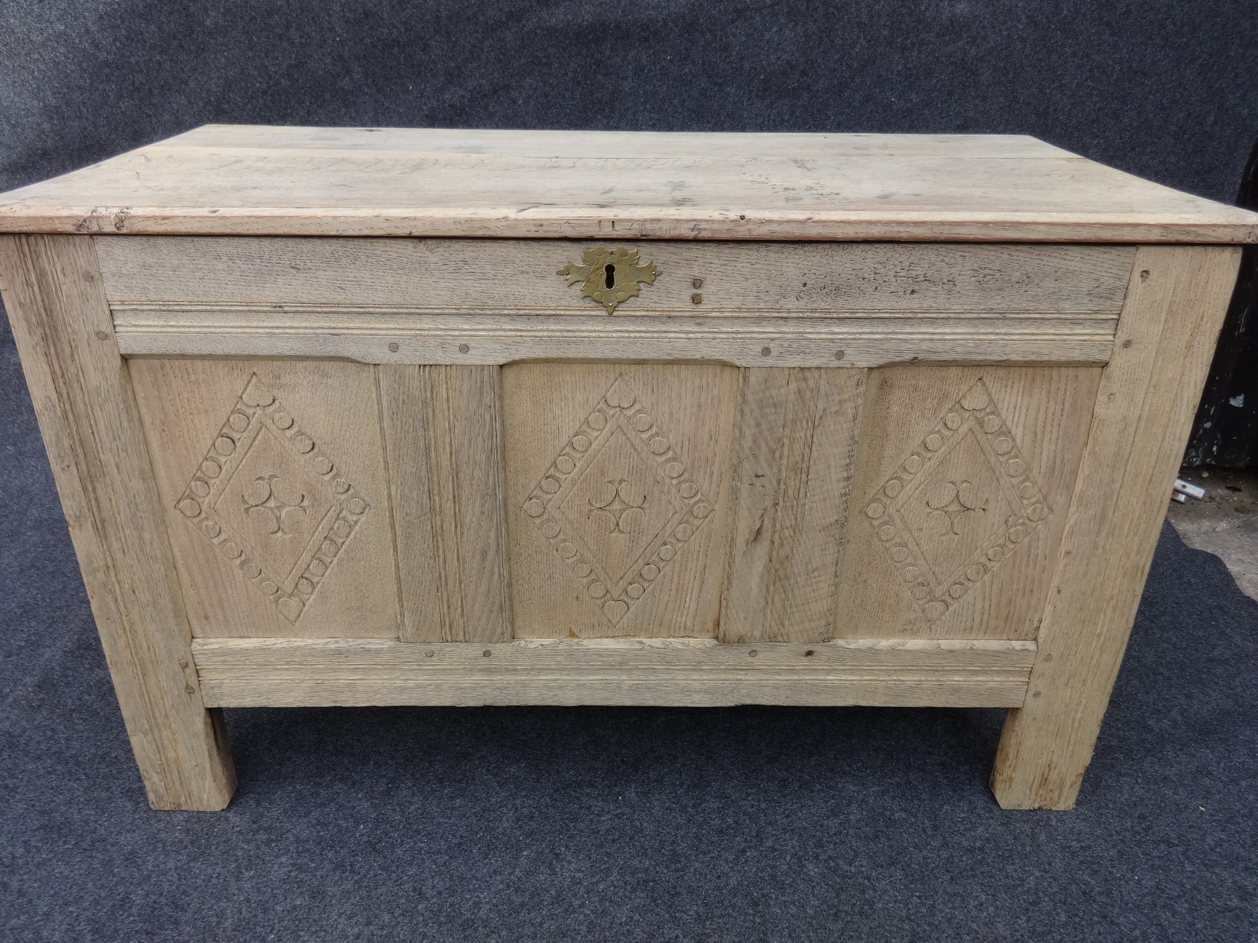 Offered for sale is this 19th Century bleached oak antique coffer with brass key plate. It is peg jointed throughout, in good overall condition.