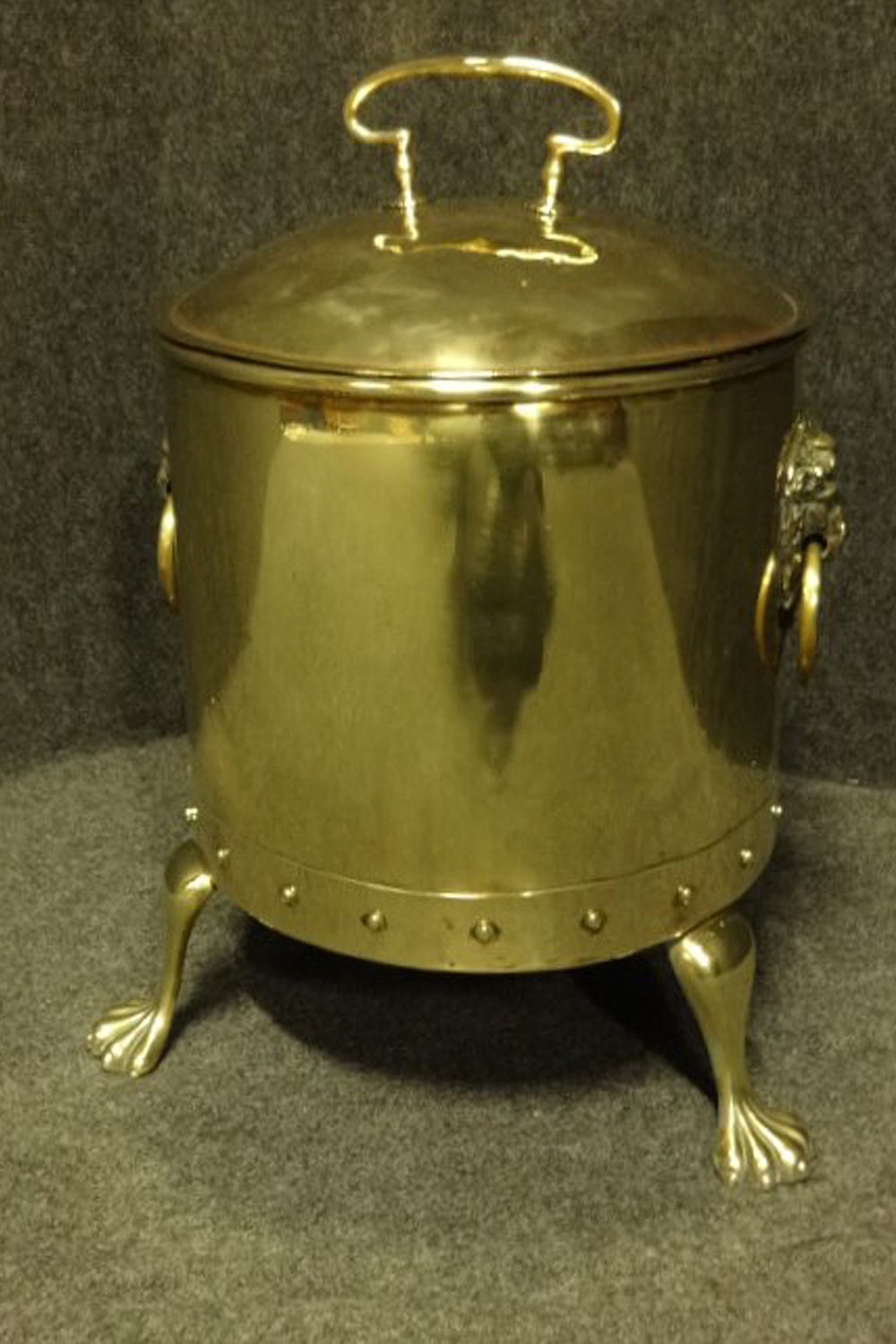 A good brass coal, log bin standing on paw feet with lion mask ring handles. repolished and in very good original condition.