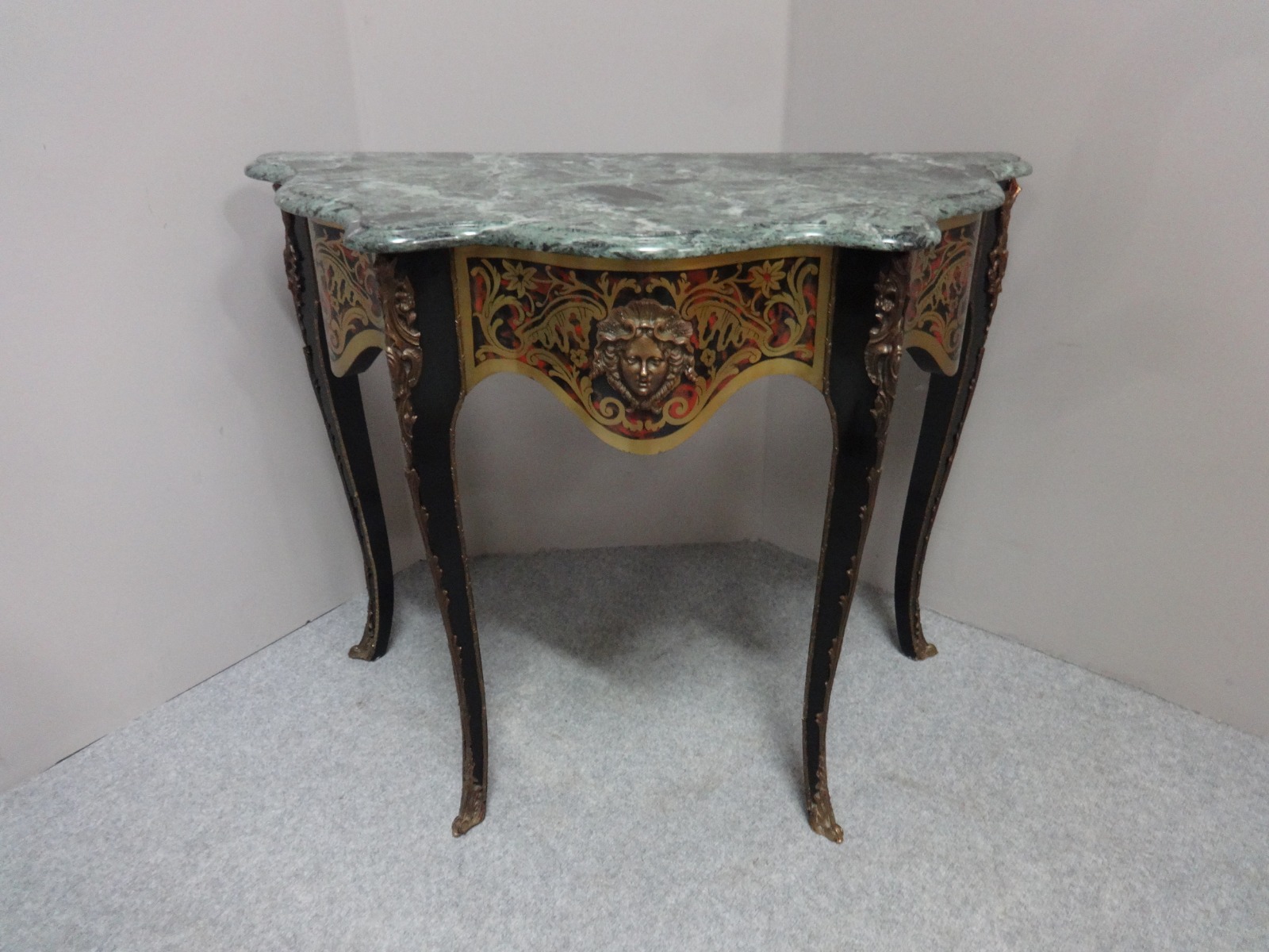 A good serpentine console table, ebonised with brass inlay, brass mounts and a very good green marble top, in excellent condition.