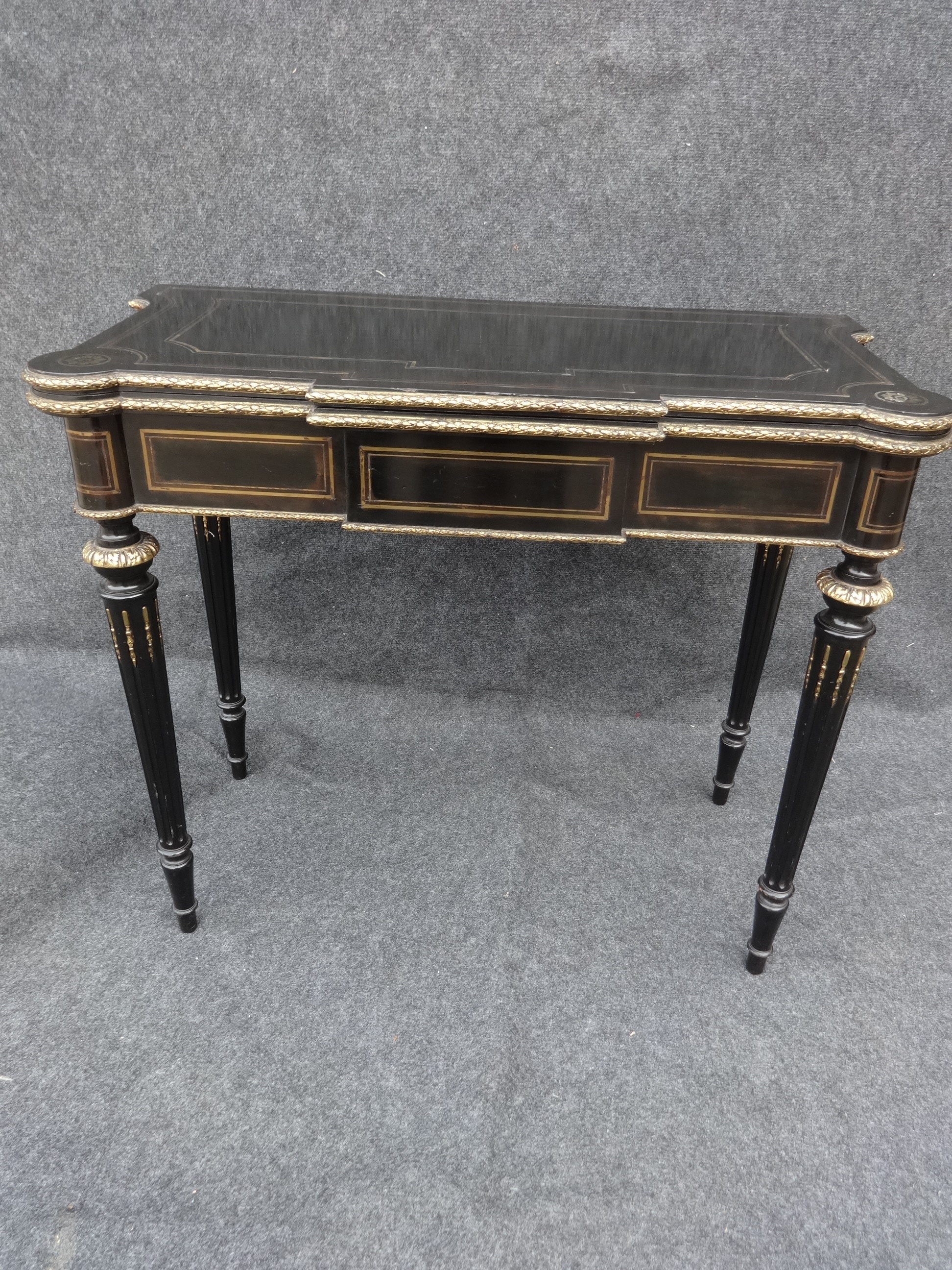 Offered for sale is this brass inlaid ormolu mounted ebonised card table. This fine antique has a shaped top, turned legs and is in very good original condition.