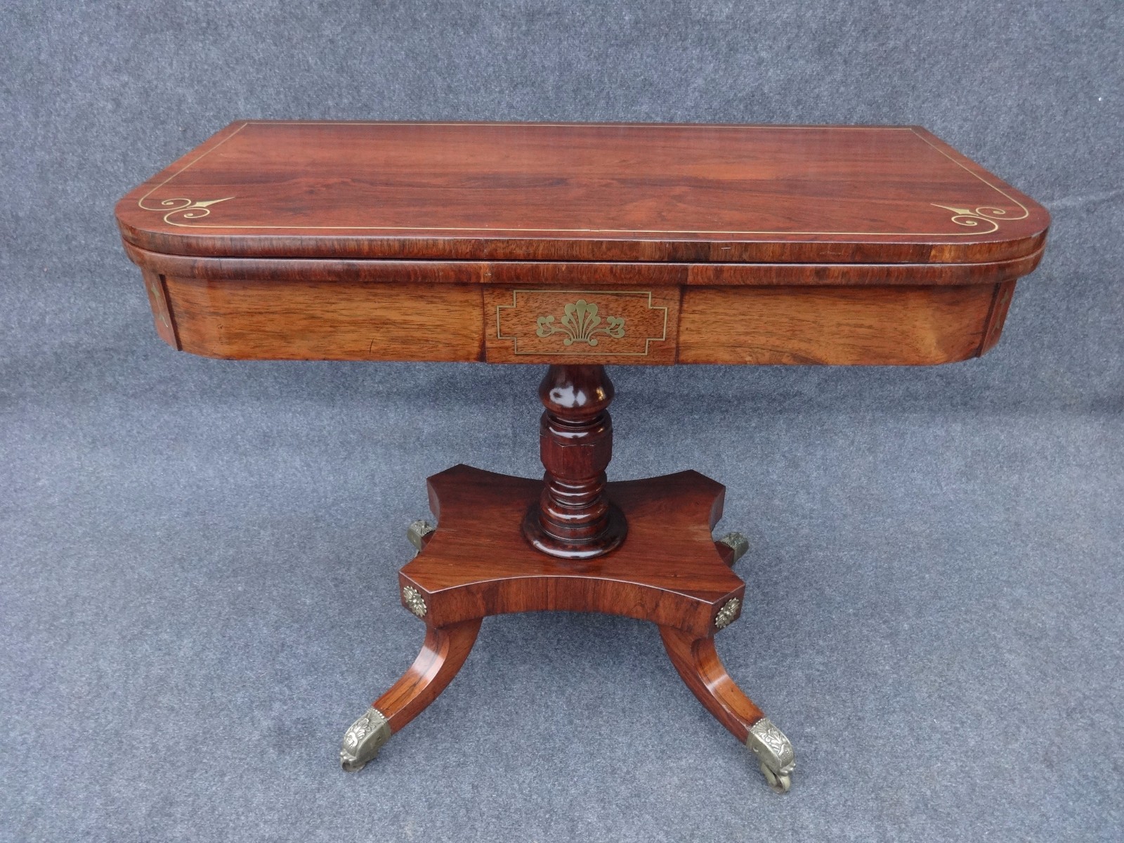 This is a fantastic Regency rosewood card table which is inlaid with brass and stands on turned column and platform base with brass detailing and toes.