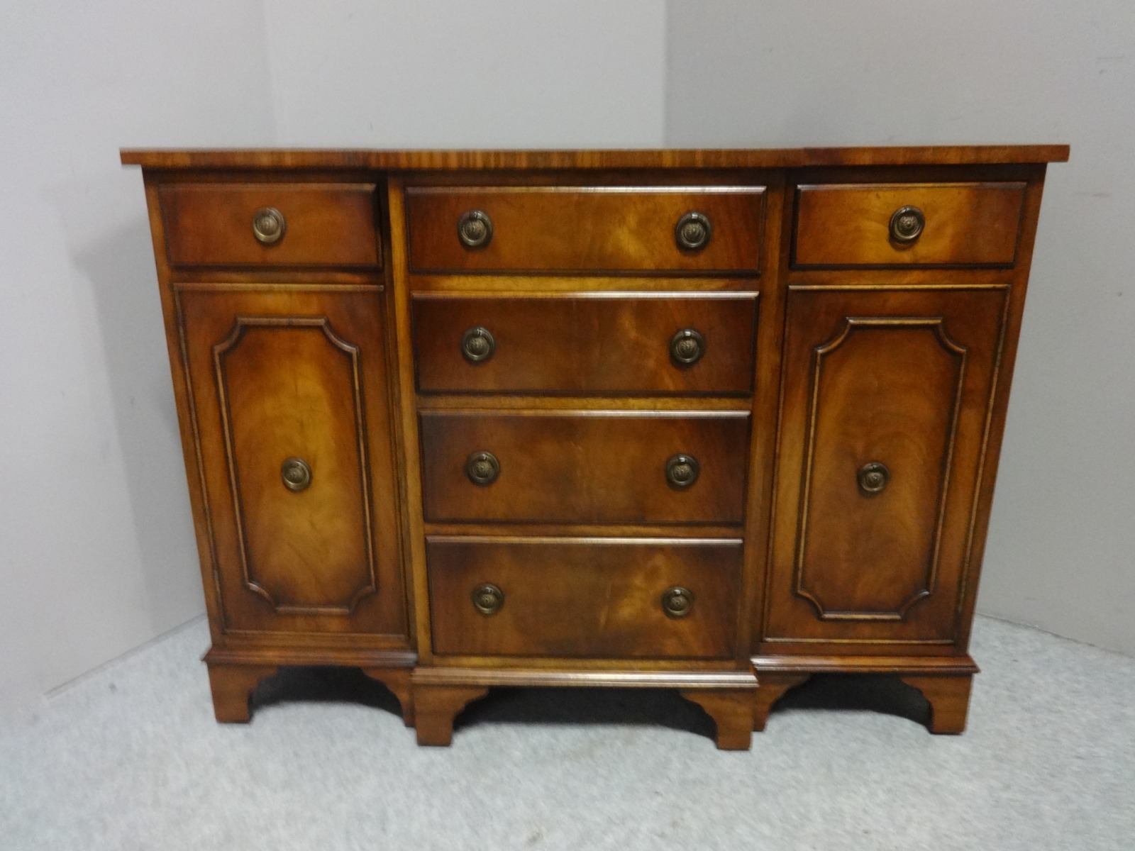 A very good breakfront mahogany sideboard with four central drawers and cupboards and drawers to either side, small proportions, brass handles.