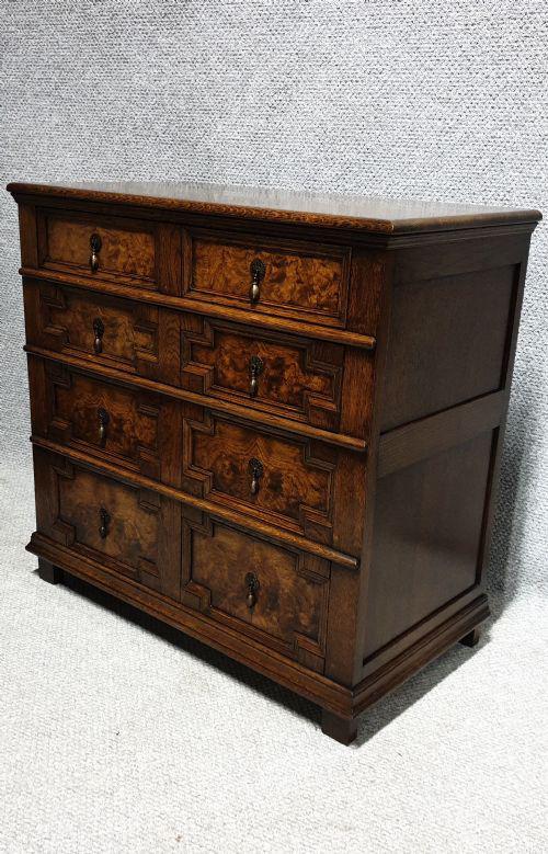 Excellent quality solid oak chest of four drawers with burr walnut panels, geometric mouldings and brass drop handles. Superb colour and condition.