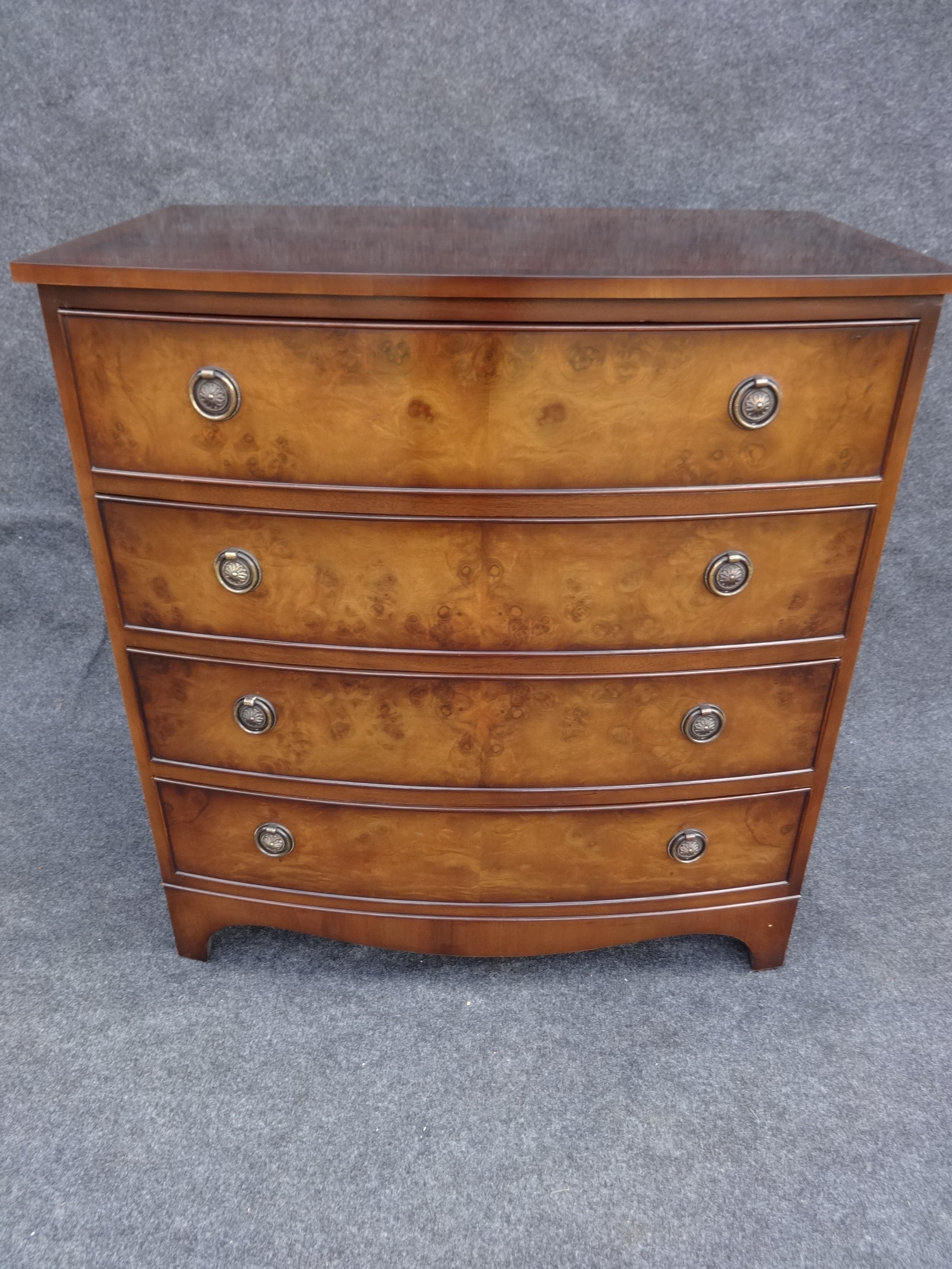 Offered for sale is this fantastic burr walnut bow front chest of drawers which has 4 drawers and is in very good condition.