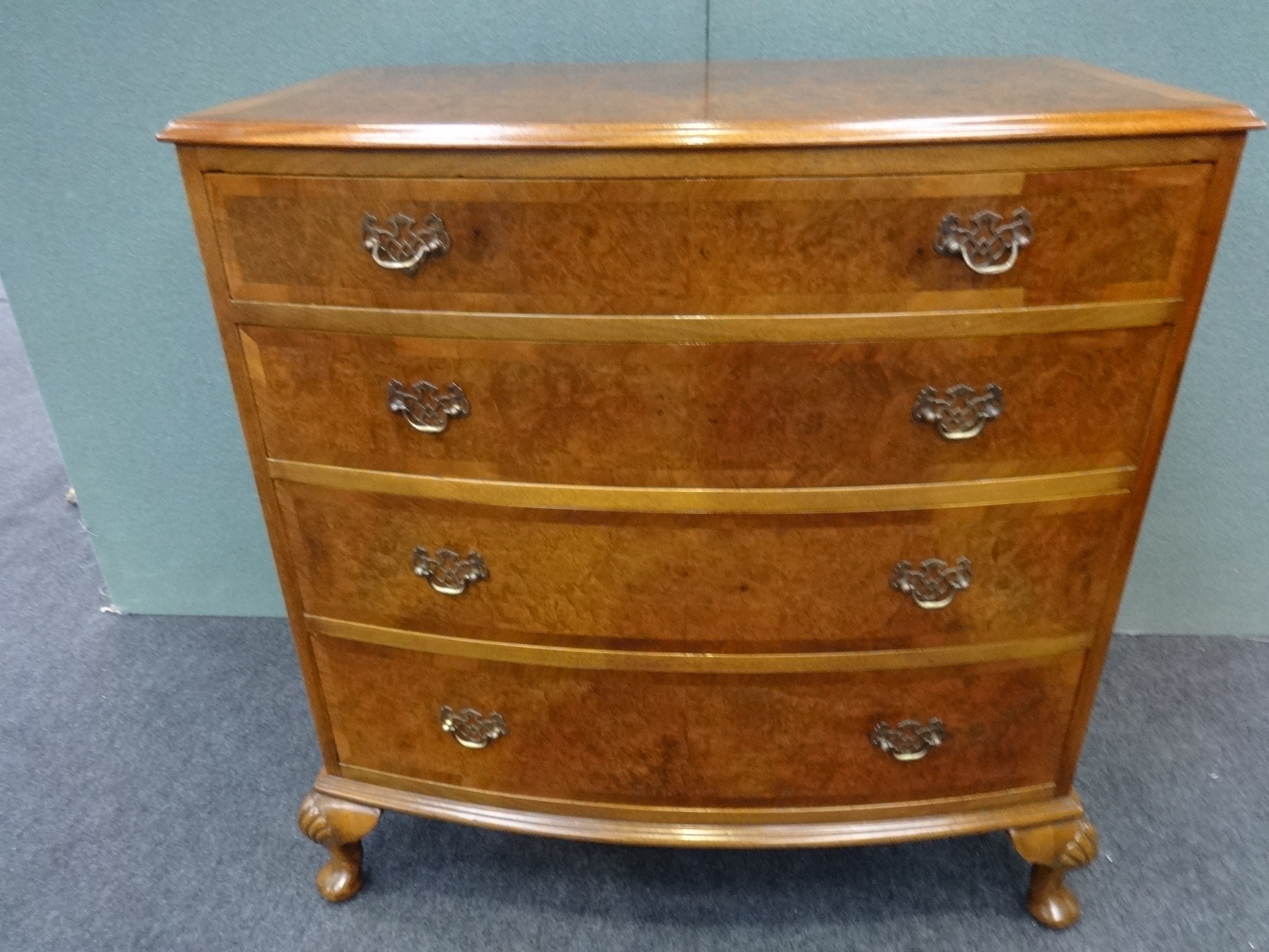 Offered for sale is this fantastic burr walnut bowed chest which has 4 long drawers with brass handles. It stands on cabiole legs and is in re-polished condition.