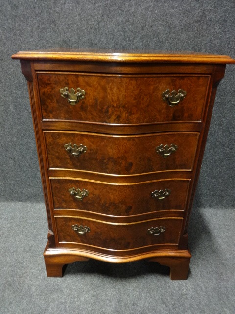 This is a very pretty burr walnut chest of drawers of small proportions, serpentine fronts and standing on bracket feet, with brass handles.