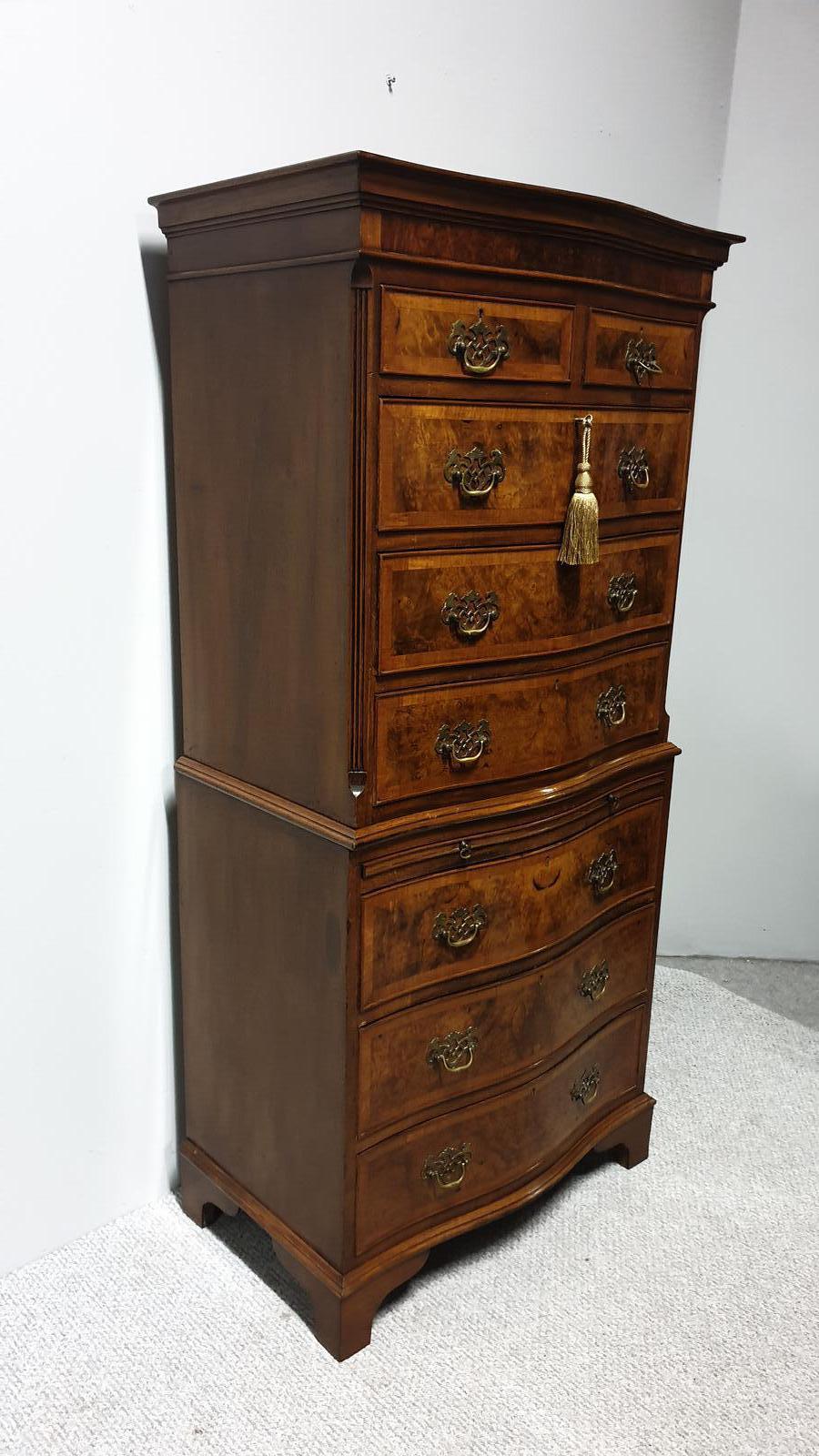 A very good burr walnut serpentine chest on chest of drawers with brushing slide, brass handles and working key, standing on bracket feet, and in excellent condition. splits into two.