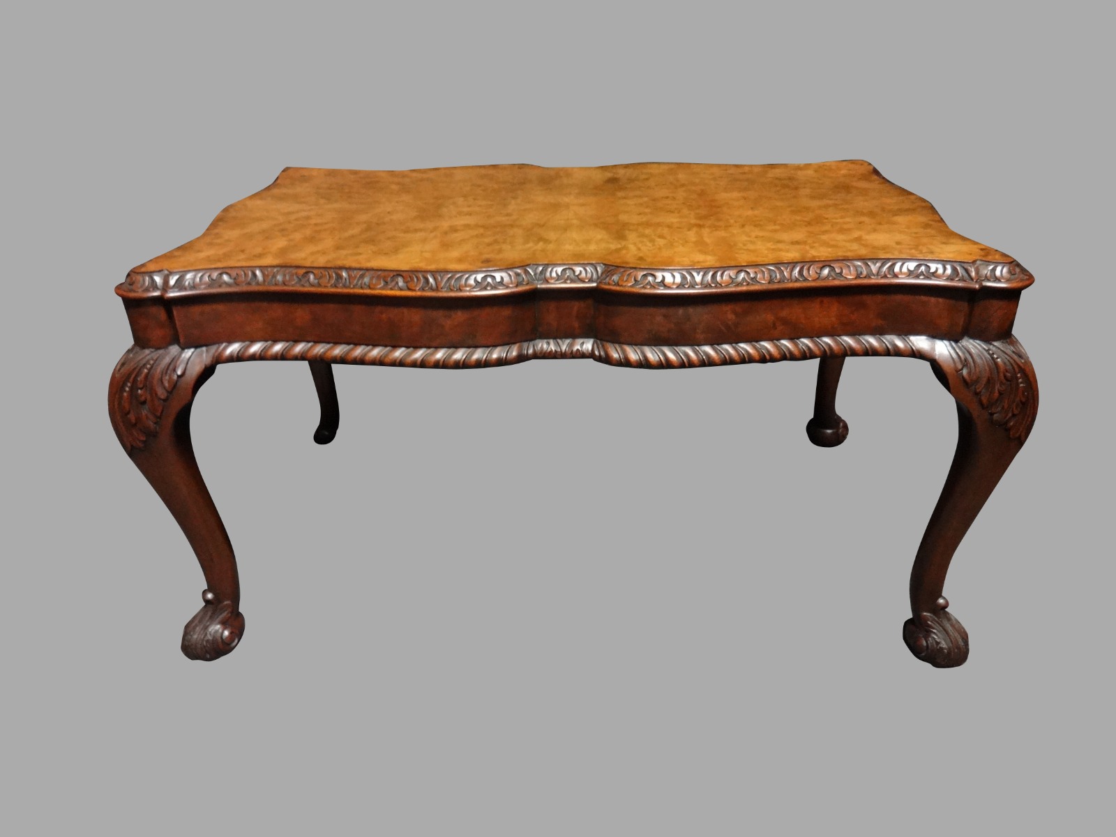 This is a very good burr walnut coffee table, standing on carved mahogany cabriole legs, robe edging and in excellent condition.