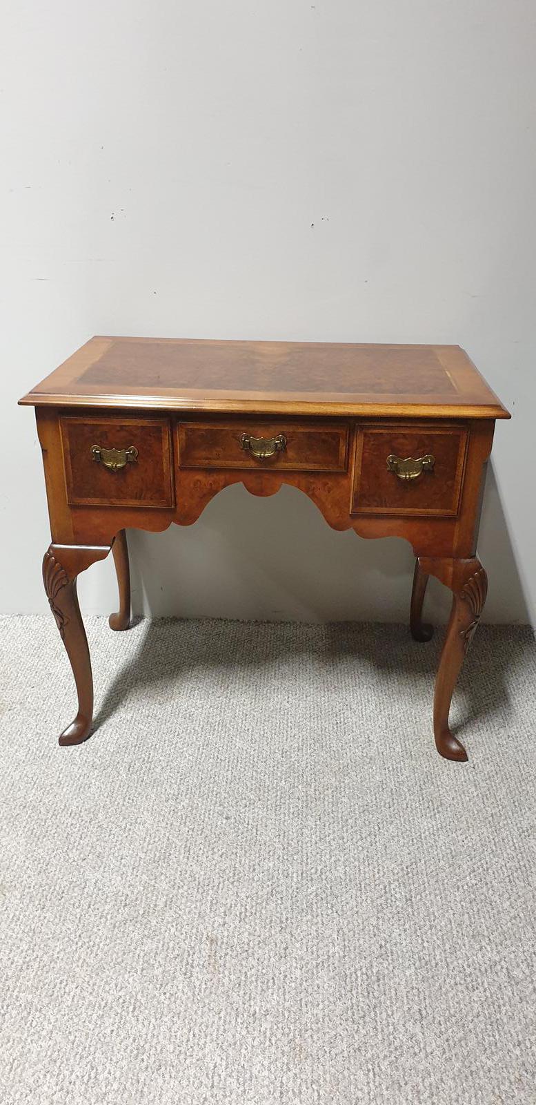 This is a very good quality oak lined walnut and burr walnut three drawer dressing table desk lowboy, standing on carved cabriole legs, brass fittings, excellent colour and condition.