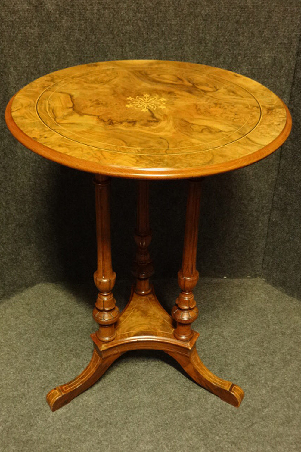 This is a very good 19th Century Victorian antique burr walnut three column pedestal table on triform base, in excellent original condition.