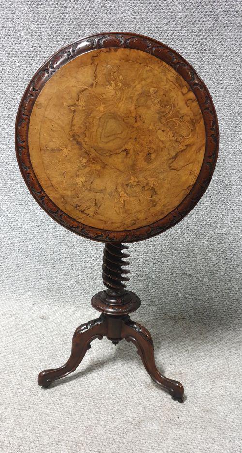 A good Victorian burr walnut flip top pedestal table, with inlaid top and deep carved twisted stem, brass castors.