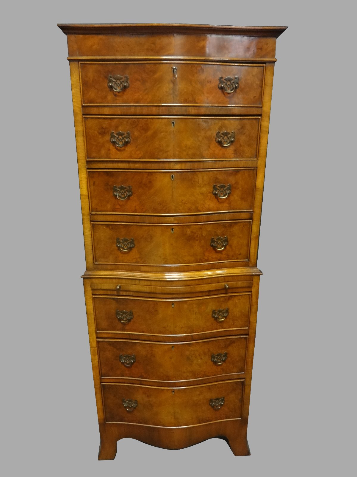 This is a very good 19th Century antique burr walnut chest on chest of drawers, seven drawers and brushing slide, serpentine shape with brass handles, in very good condition.