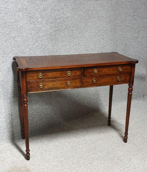 Very nice shaped freestanding burr walnut side table, with inlaid satin wood banding, four drawers with brass handles, standing on reeded legs, excellent colour and condition.