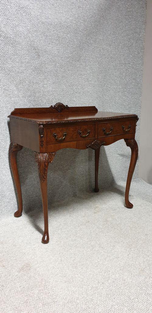 A good two drawer burr walnut Sidetable with brass handles and standing on carved cabriole legs, excellent colour and condition