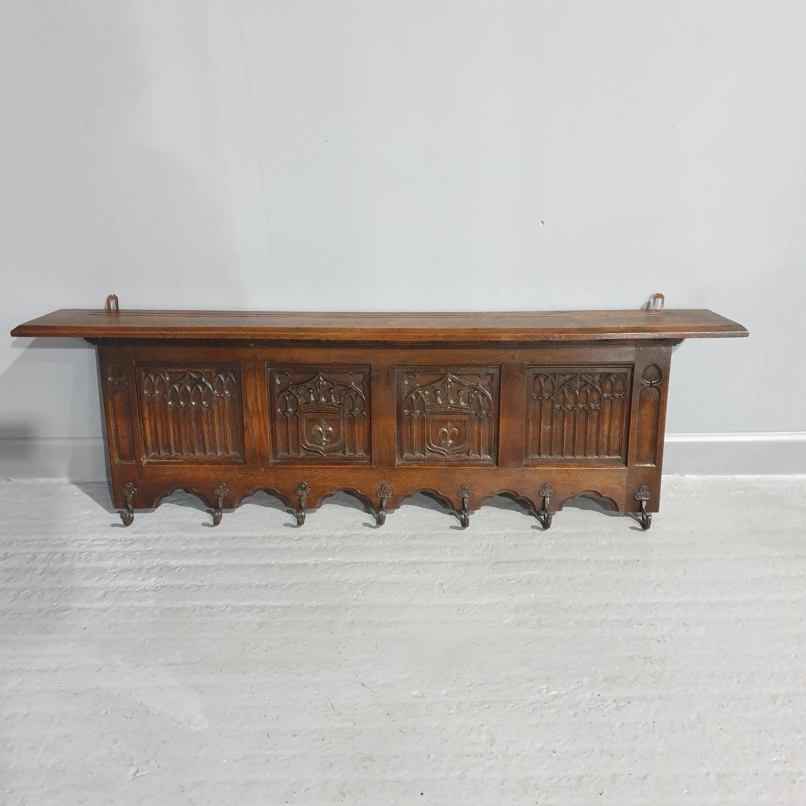 This is a very good carved oak coat rack, four carved panels, seven wrought iron hooks, shelf to the top, excellent colour and condition.