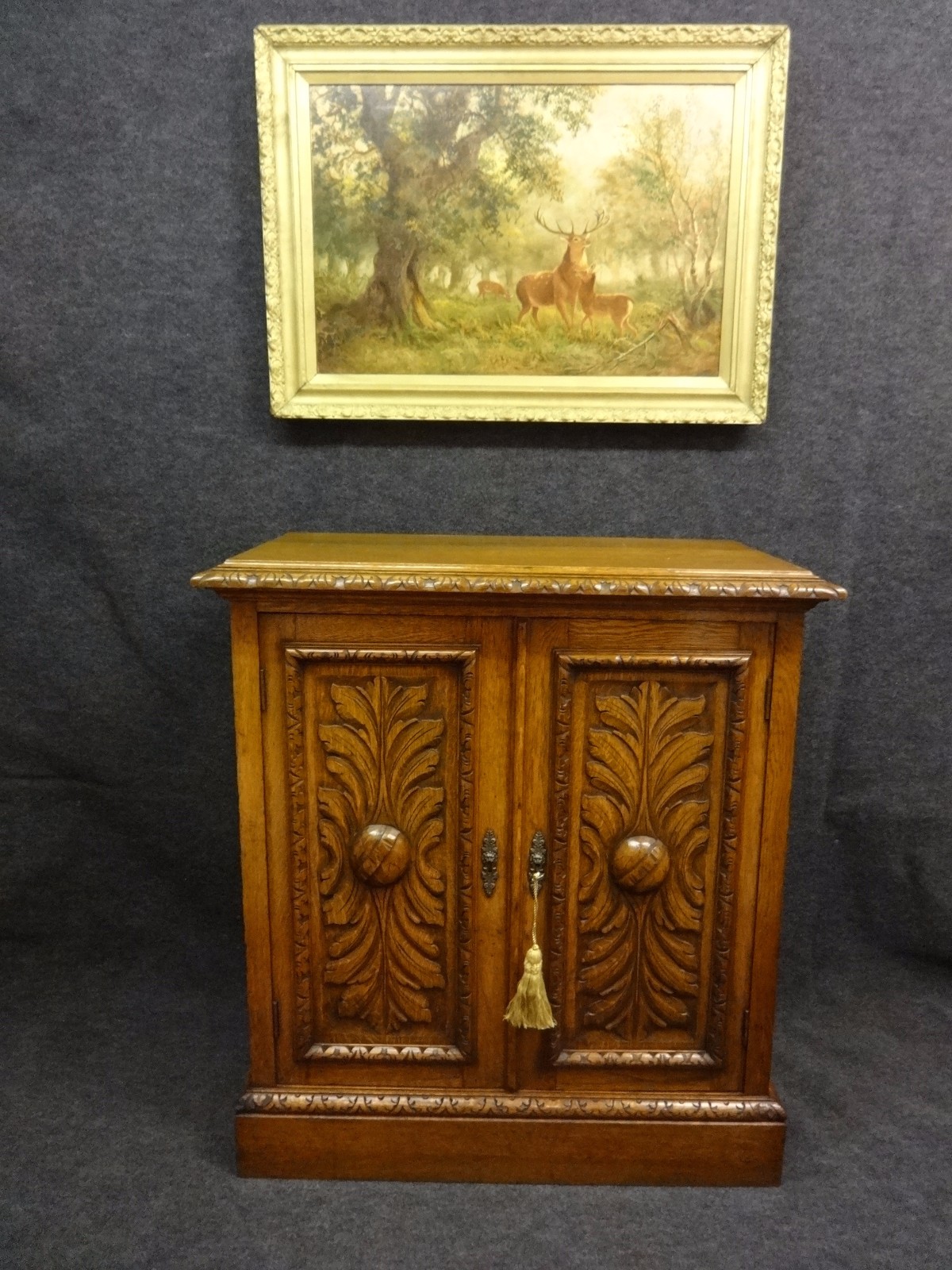This is a very good looking 19th Century antique carved oak side cabinet with 2 impressive carved door, shelf inside, good golden oak colour and in excellent condition.