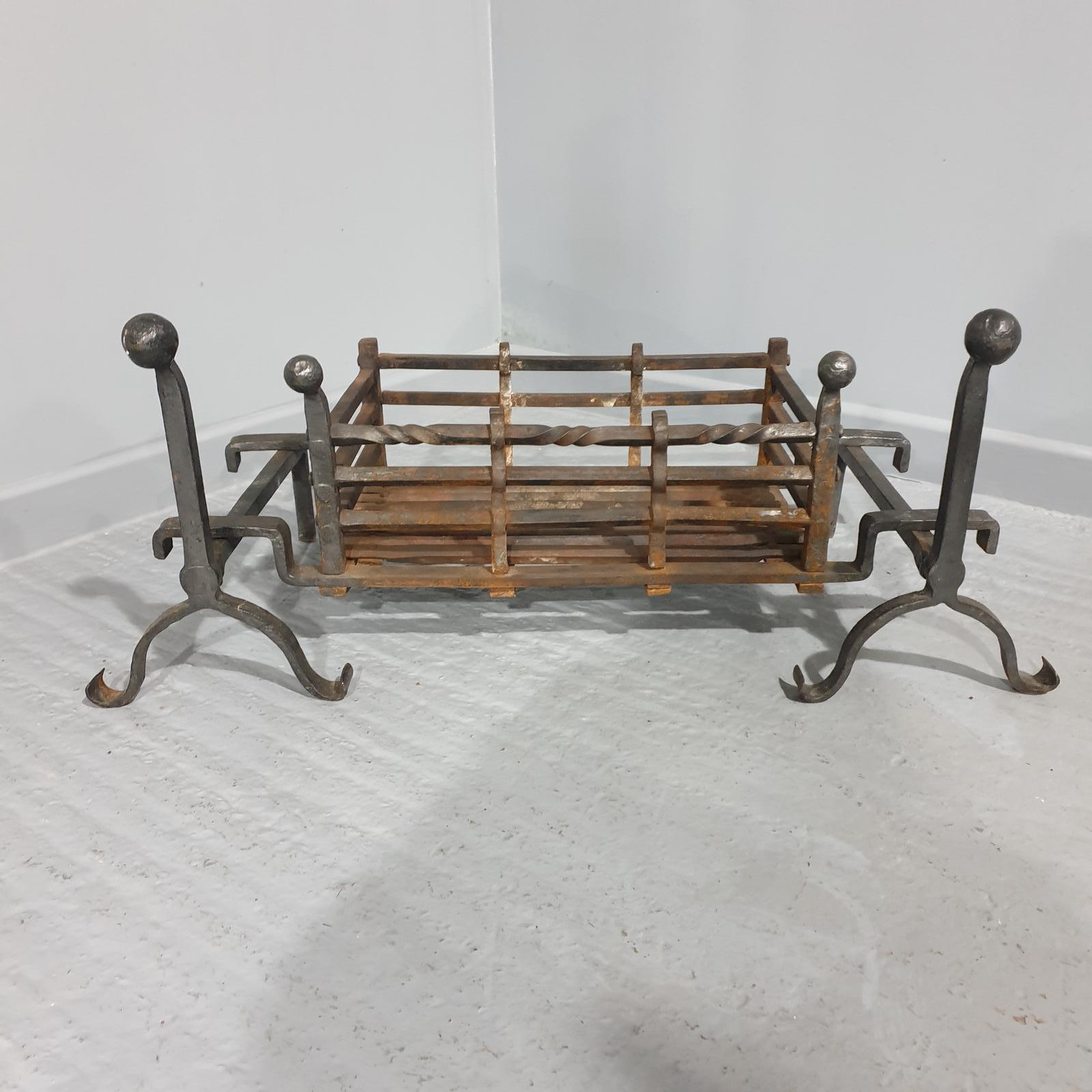 A very good cast iron fire basket on fire dogs and ash tray, comes with cast iron fireguard.