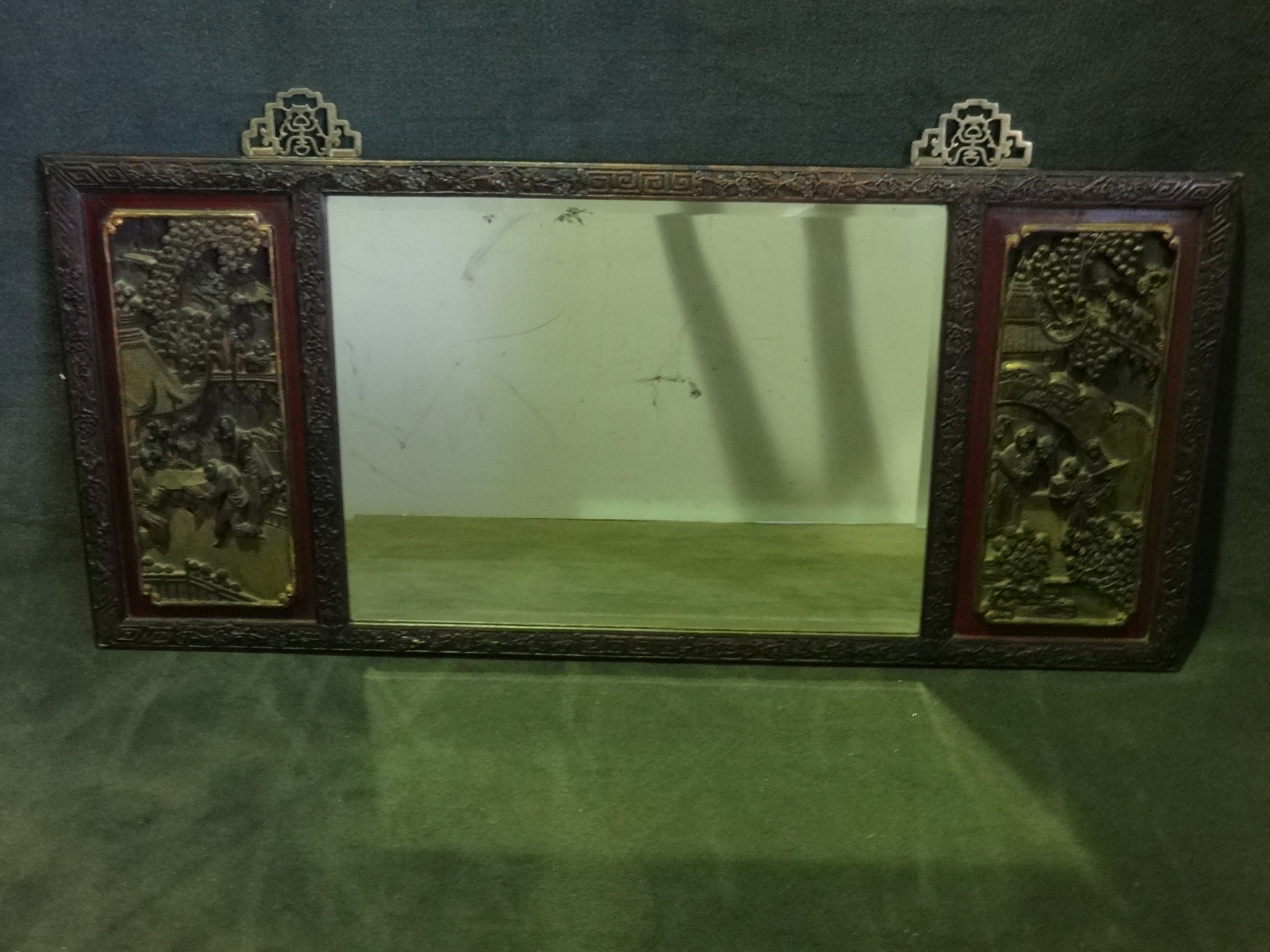 Offered for sale is this fantastic Chinese carved mirror with carved panels either side a central mirror, brass embellishments, in excellent original condition.