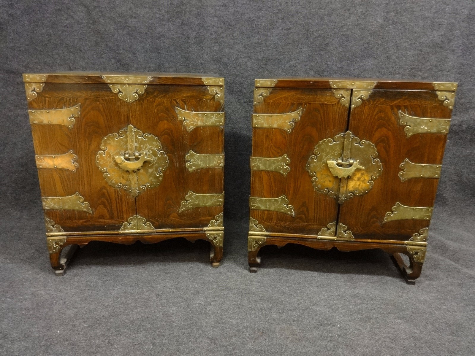 In excellent condition with brass applied decoration to the outer doors, both with original chinese keys, inside with a single shelf and 2 drawers, in excellent original condition.