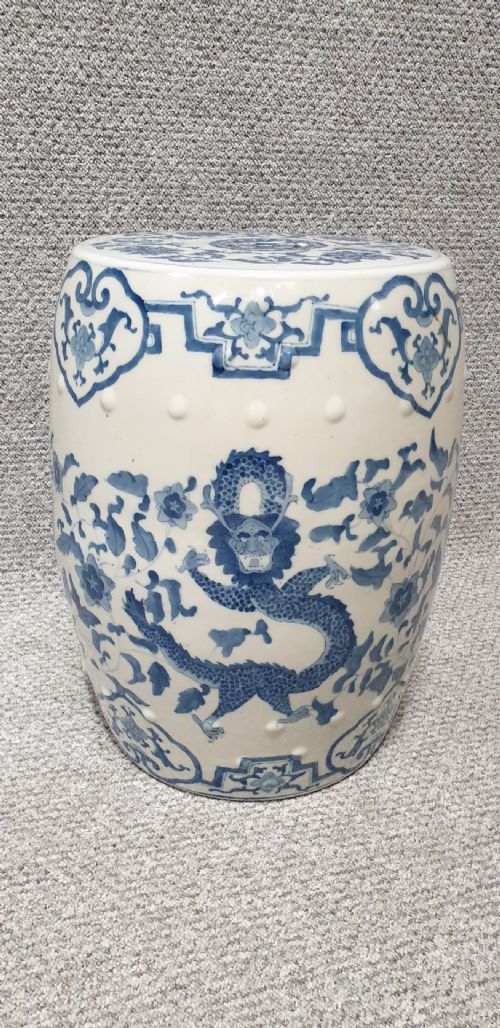 A very good Chinese antique pottery garden / conservatory seat, decorated on underglaze blue, moulded stud and pierced decoration.