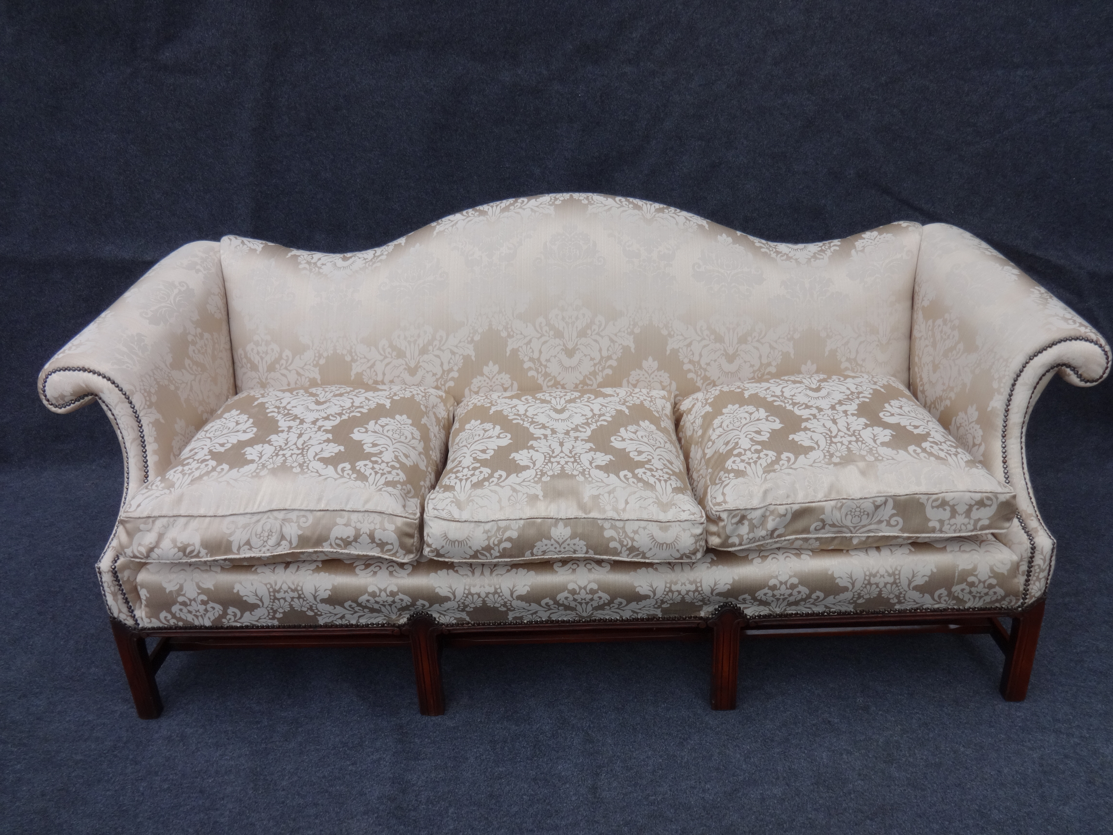 Large sofa with a camel back, with outswept arms, a stunning sofa recently upholstered in ivory damask, 3 feather filled cushions, 3 legs across the front, in excellent condition.