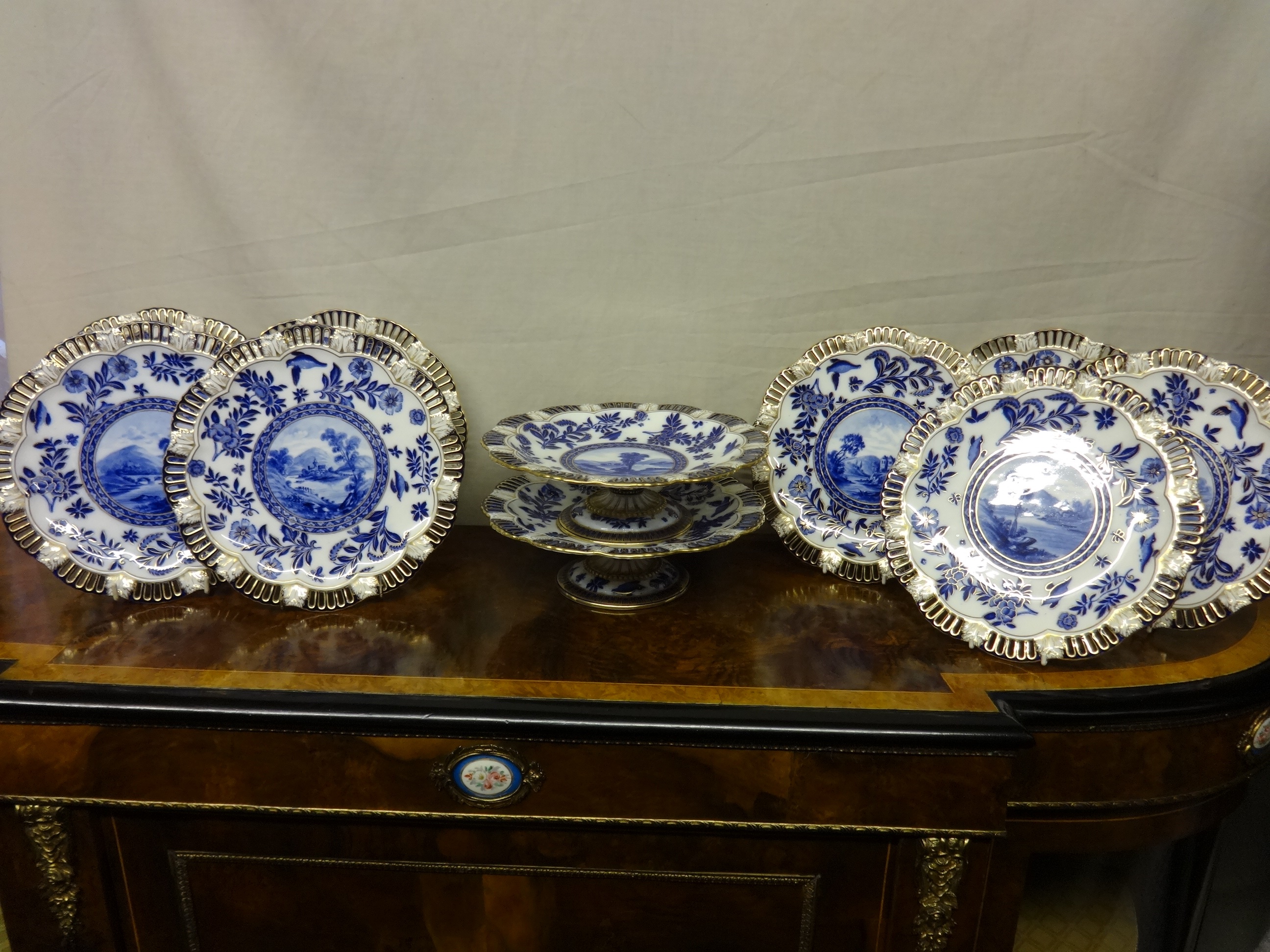 A fantastic Coalport 10 piece desert service set comprising 2 comports and 8 plates, all with wavy and pierced edge, and all with different countryside scene, the border with flowers, birds and insects.