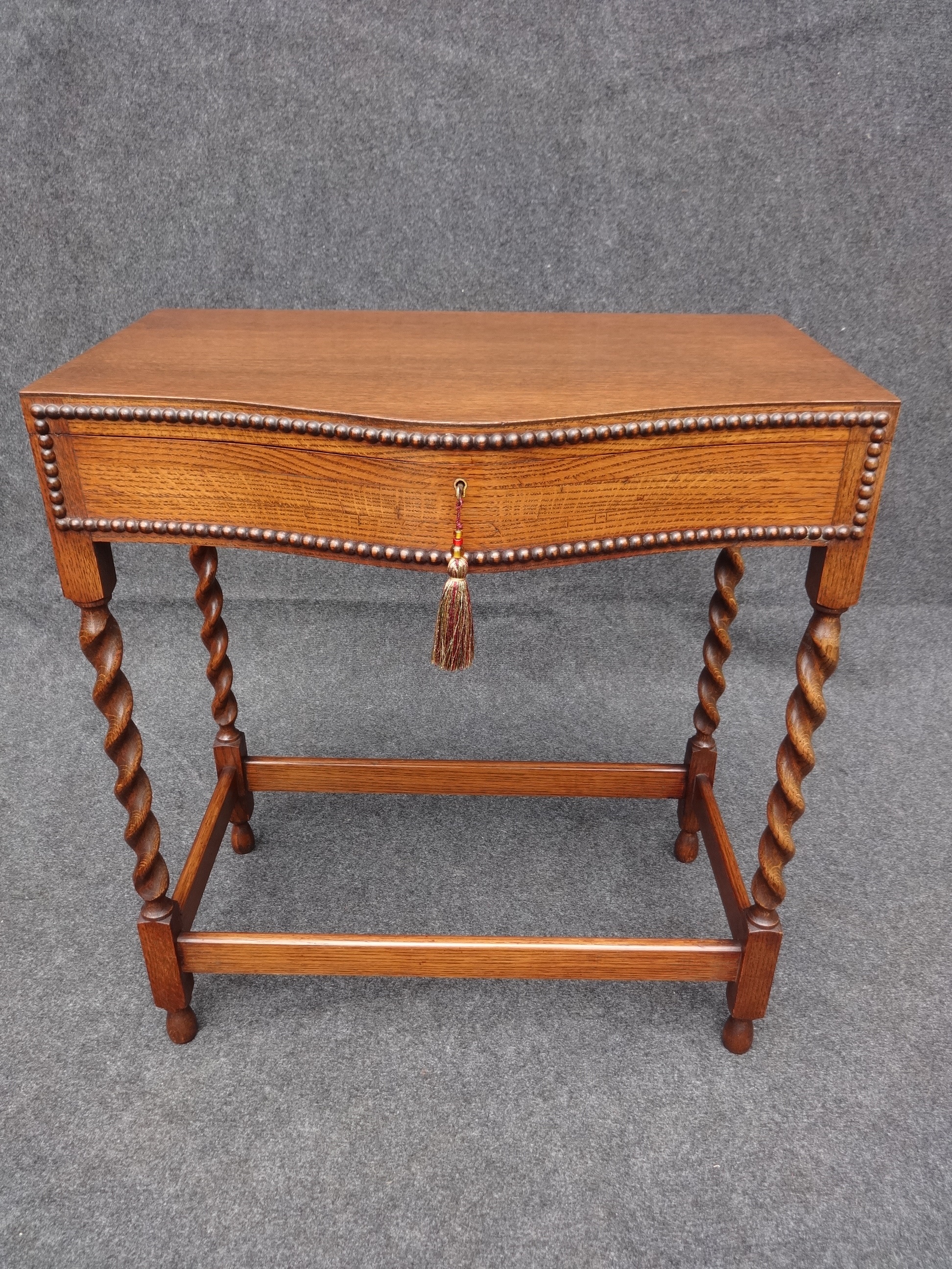 Excellent quality serpentine oak cutlery case standing on barley twist legs, original key, with complete set of rat tailed cutlery for 6 people, including fish knifes forks and servers, main course sets and carving set, all in excellent original condition, cutlery needs polishing.