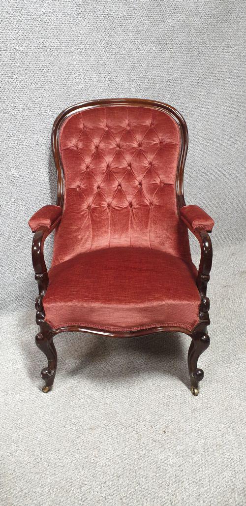 A very nice Victorian mahogany spoon Backed armchair on brass castors, original deep buttoned plush upholstery. Excellent original condition and extremely comfortable.