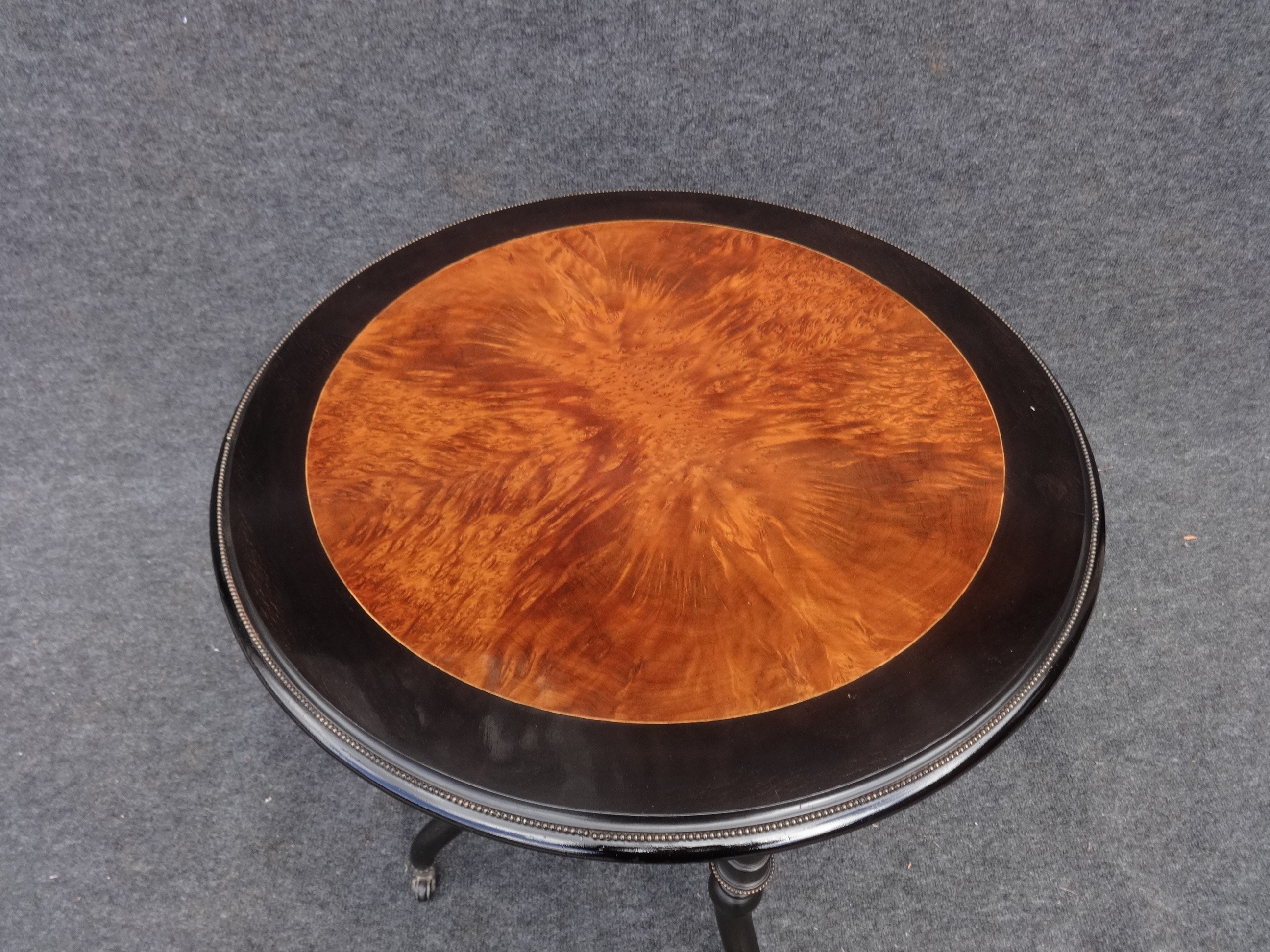 This is a fantastic antique 19th Century ebonised and mrytal occasional table which has brass bobble embellishments. It stands on black porcelain castors and is in excellent condition.