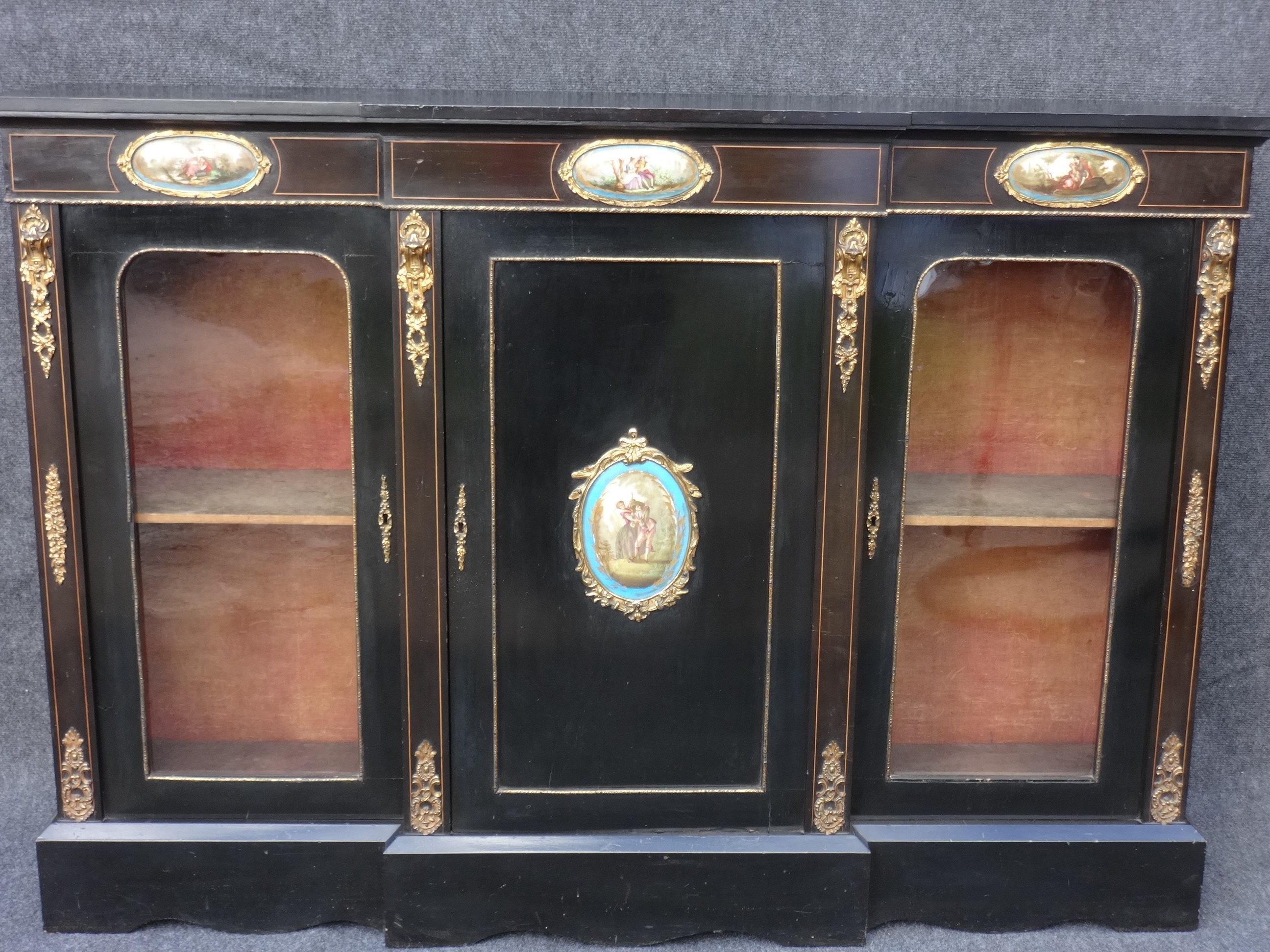 An ebonised breakfront side cabinet/ credenza with 2 display doors and one central cupboard, ormalou mounts and 4 excellent quality sevres style porcelain plaques, in very good condition.