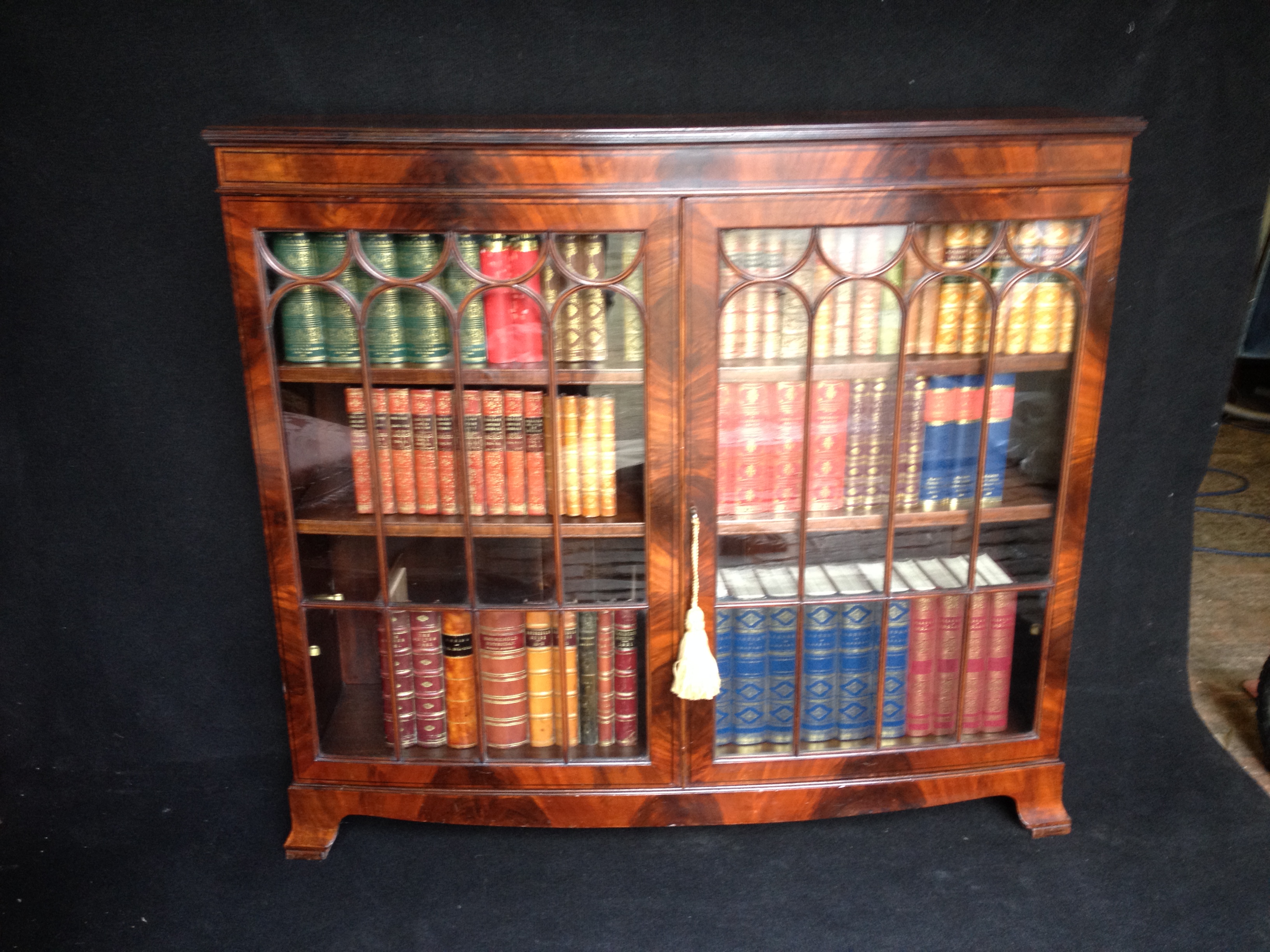 inlaid with ebony stringing, 3 adjustable mahogany shelves, bracket feet, solid oak back.