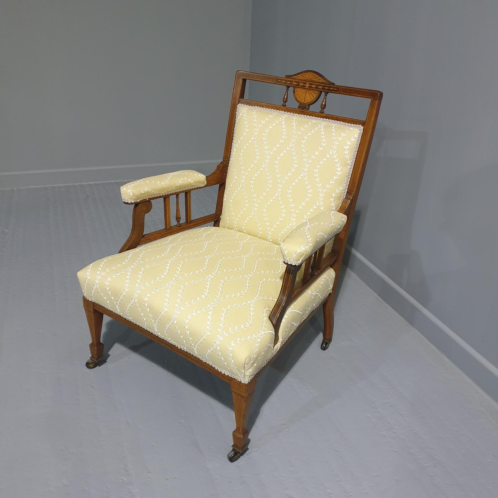 This is a very good Edwardian antique rosewood armchair with inlay detailing, recently recovered in embroidered linen fabric. Standing on brown porcelain castors.