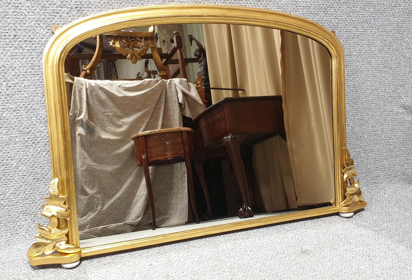 A very elegant Victorian English gilt arched top Overmantle mirror with side detailing and white porcelain feet, very good overall condition.