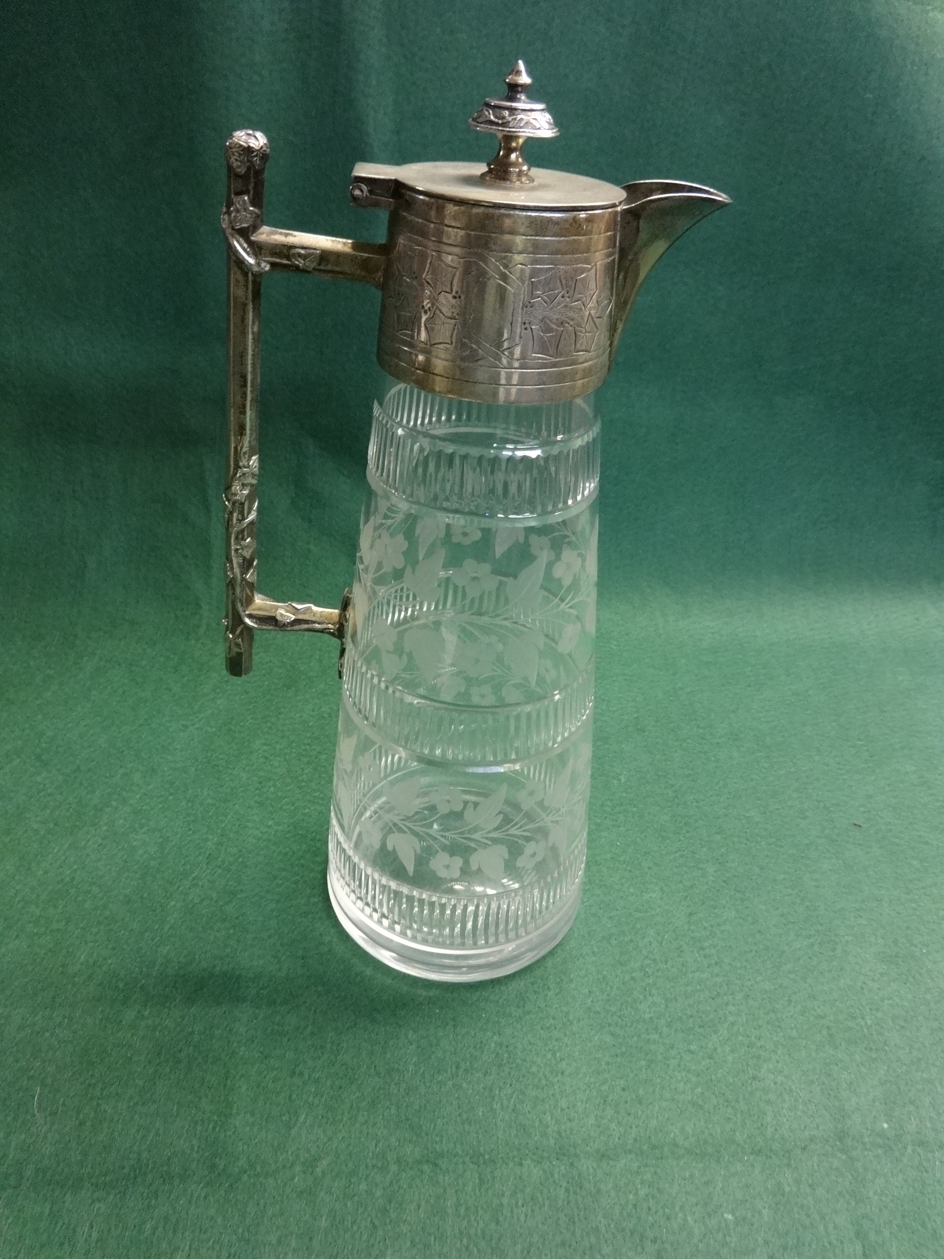 Offered for sale is this etched silver plated claret jug which has a cut etched body, silver plated with vines and is in excellent condition.