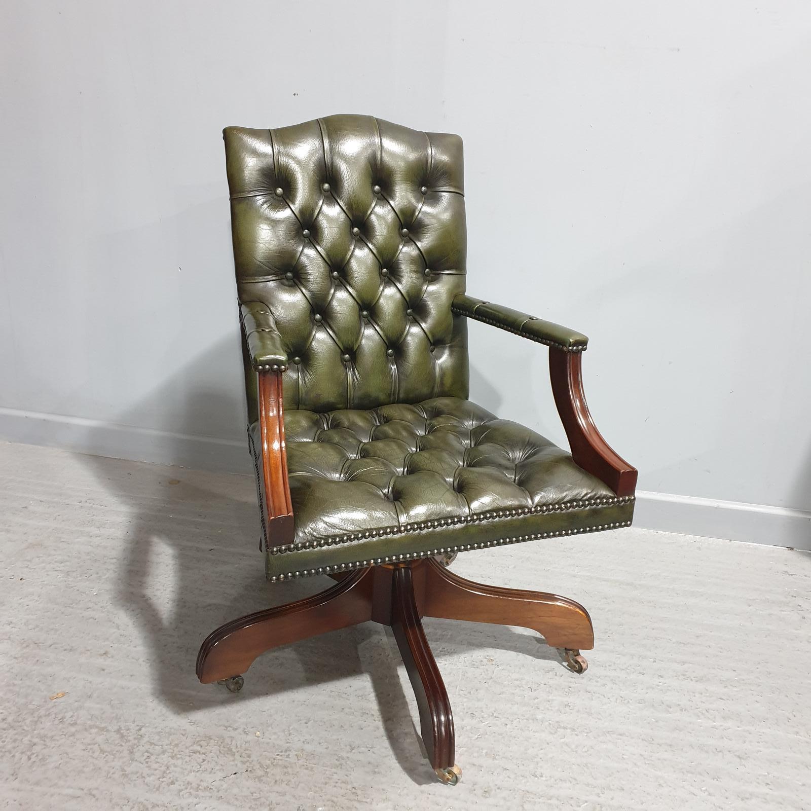 Very good green leather and mahogany deep buttoned size and fall office desk chair, brass castors, in excellent condition.