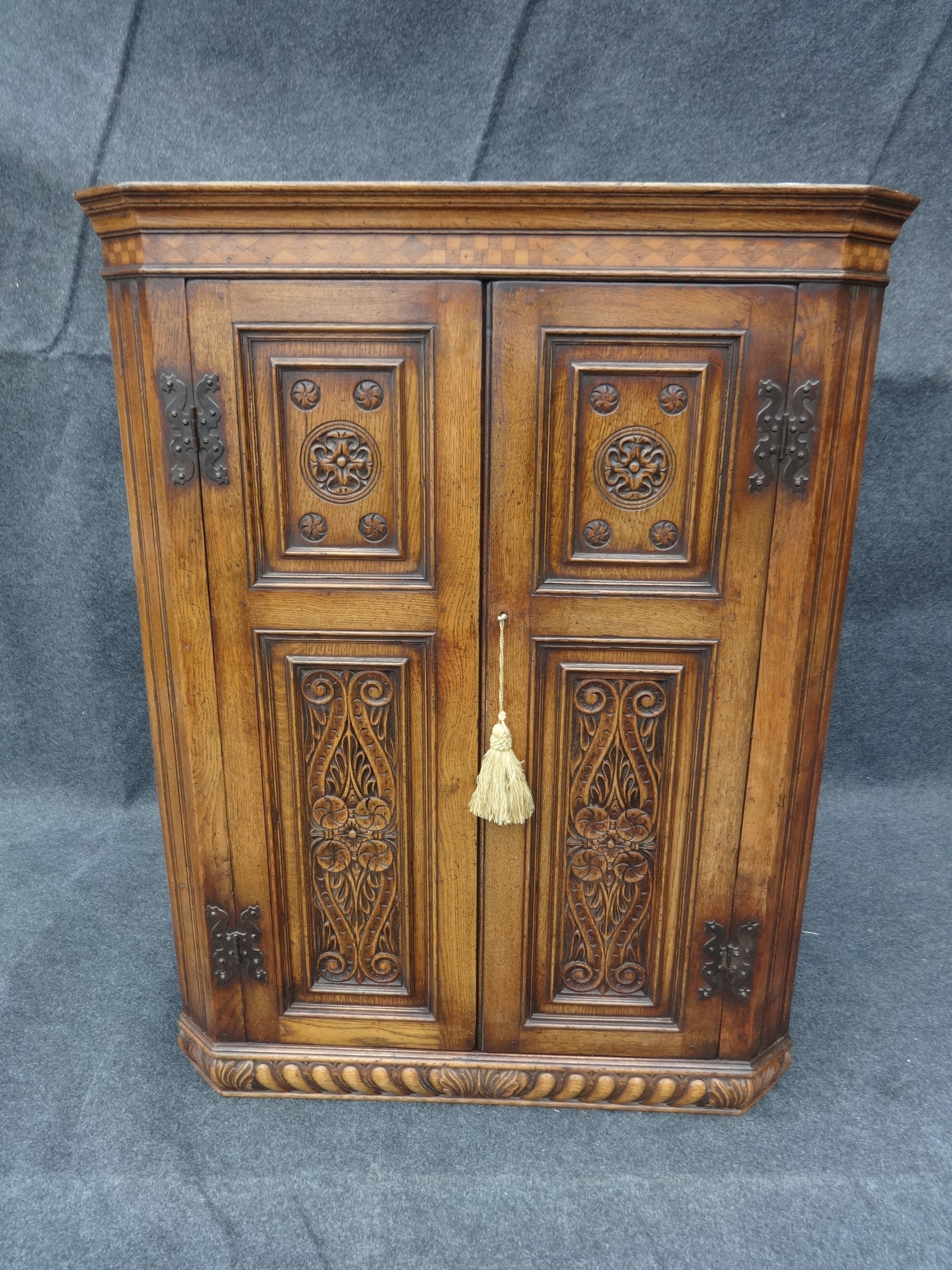 Offered for sale is this excellent inlaid oak hanging corner cabinet with 2 carved panelled doors, inlaid cornice, peg jointed construction, in excellent condition.