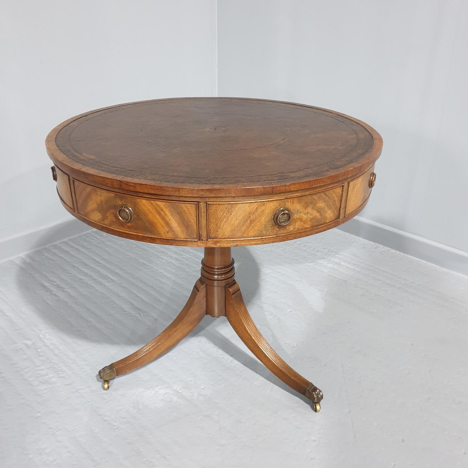 Very nice original quality mahogany four drawer pedestal drum table, on cannon column base and reeded legs with brass toes and castors ,brass ring handles, and brown leather top, oak lined, and in excellent original condition.