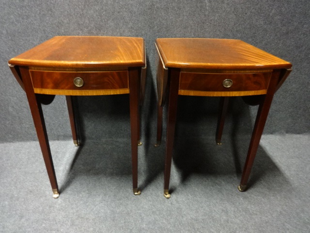 These are a stunning pair of solid mahogany sofa tables or end tables, oval tops with boxed fronts, working drawer to one end, dummy to the other, brass ring handles, satinwood banding, tops have been re-polished in our showrooms, standing on brass castors. and in excellent condition.
