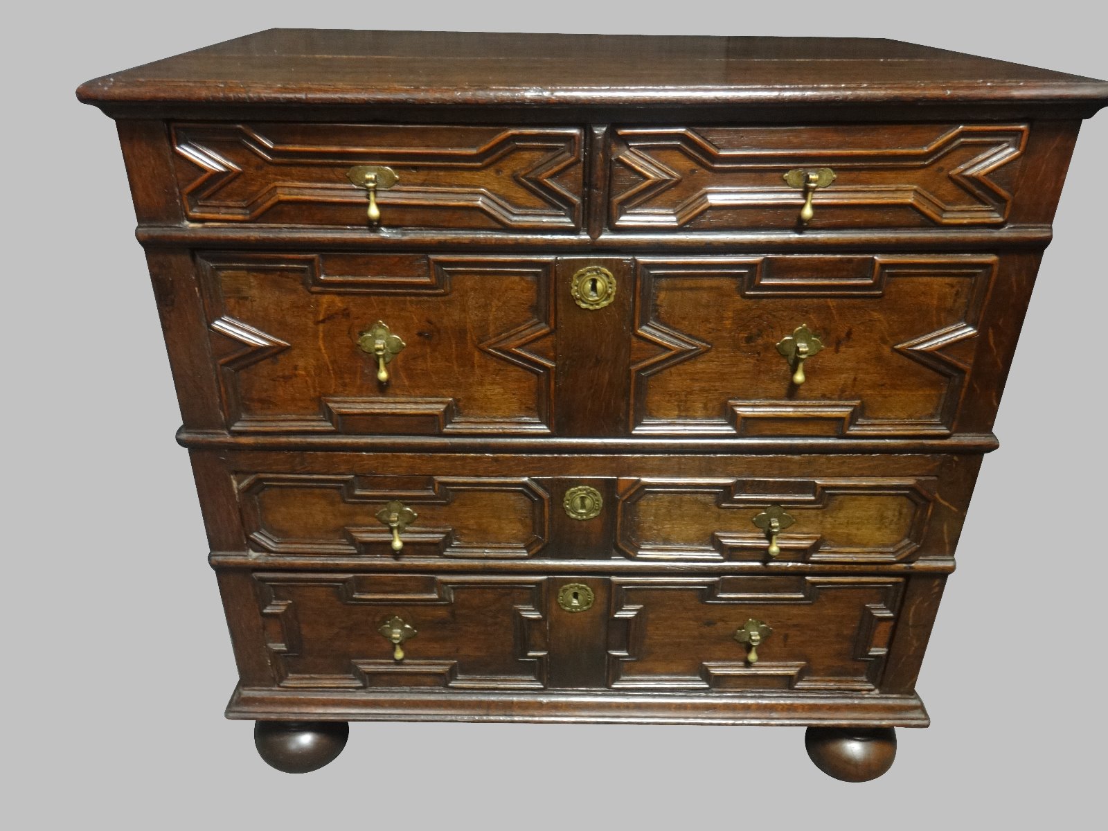 This is a very good 17th Century chest of drawer, four graduated drawers with applied mouldings, handles replaced in 1700's, splits into two, panelled sides, peg jointed throughout, in very good condition with an excellent colour.