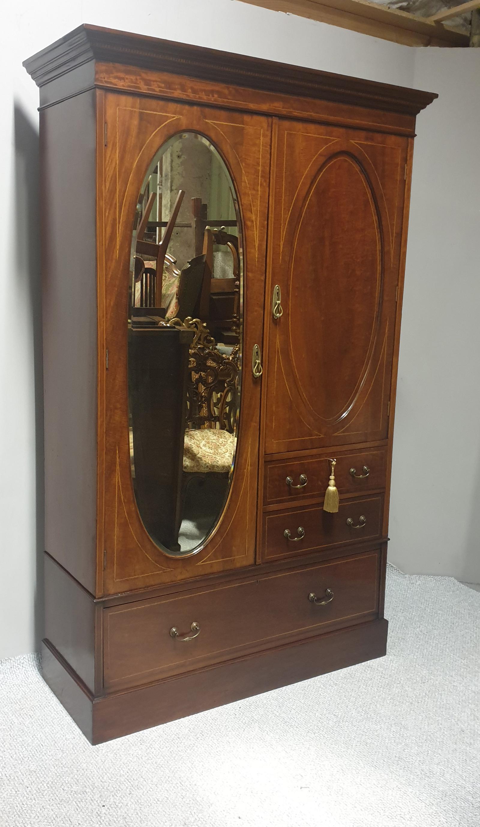 A very nice Edwardian in laid compactum wardrobe, two hanging sides, full width deep drawer and two smaller drawers, full length bevelled mirror, excellent colour and condition