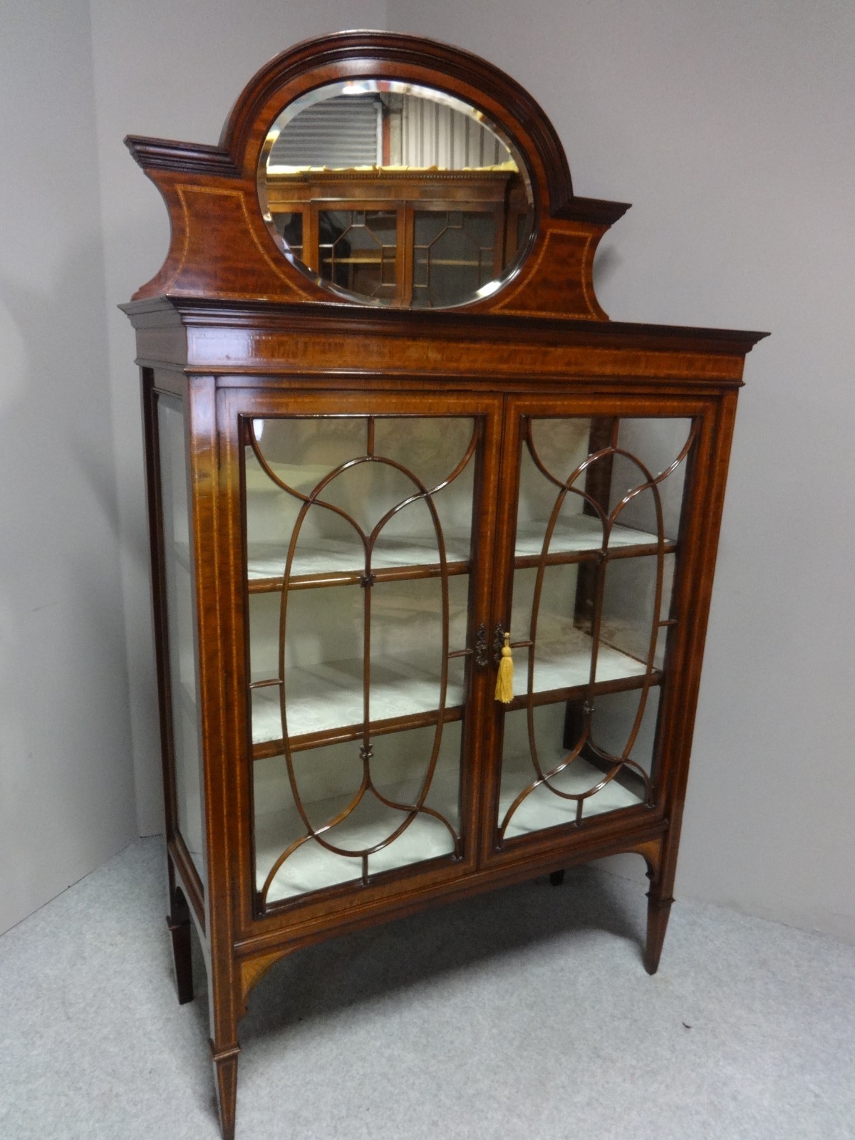 A very nice quality inlaid mahogany display cabinet with two shelves, beveled glass sides, fully relined in cream fabric, excellent colour and condition.